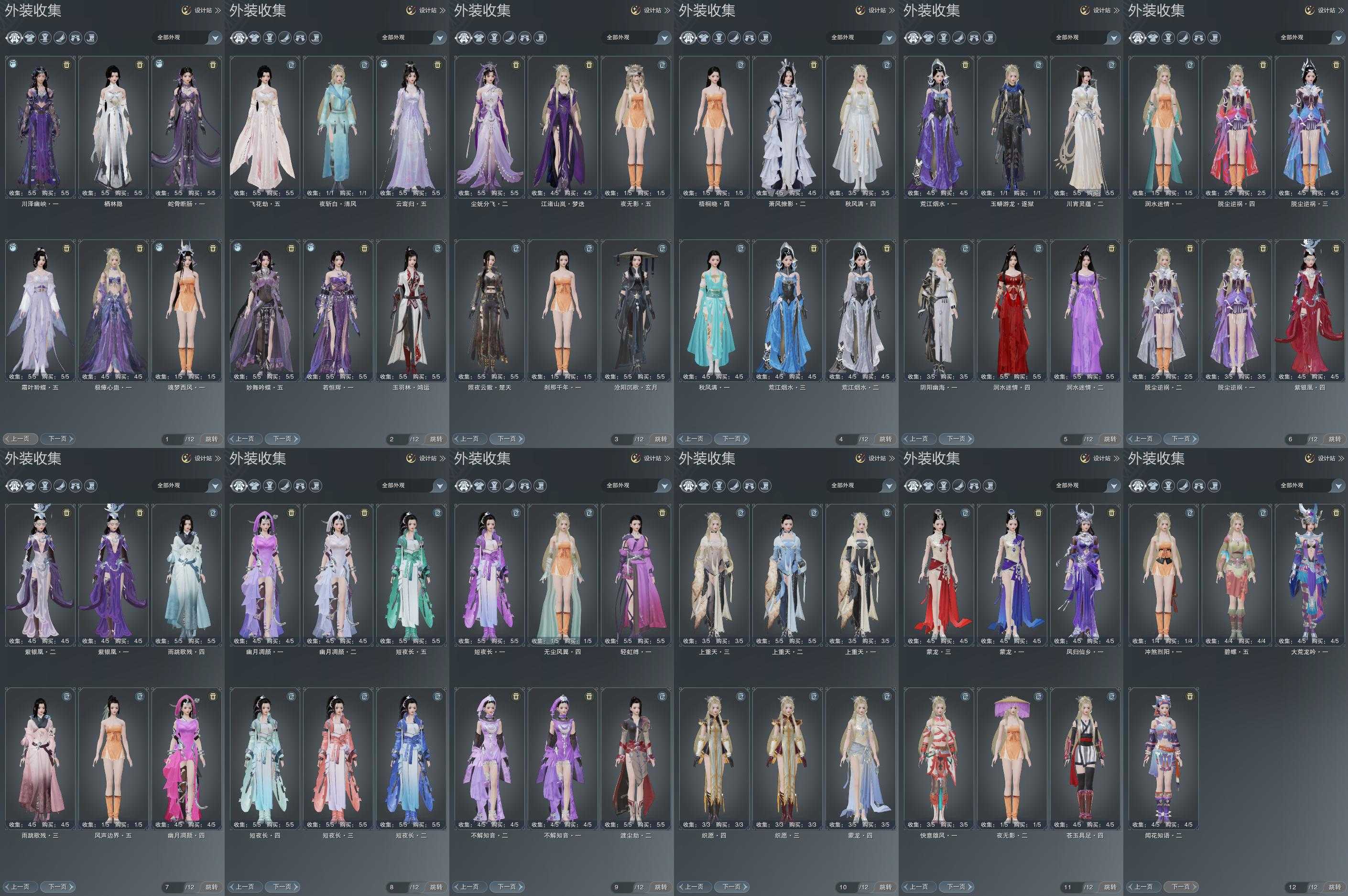 限时限量:[水云寒桑海, 水云寒重风, 打歌服, 水云寒写晖, 蓝九壤, 水云寒雪涛, 兰庭凤香, 红云飞, 重华绯仪, 兰庭冷绣, 海韵小调, 兰庭金烬, 道袍, 紫玫瑰, 红玫瑰, 红长天, 微草武陵, 雪衣寒月, 绿封川, 黑天涯, 天涯旌湖, 望云绛霞, 紫舞步, 重天夜歌, 霆螭月华, 侠影飞瀑, 十三万资历衣, 霆螭凝霜, 侠影空山, 锦夜游蔚苍, 金浮琅玉, 中宵霆露, 踏月濯香, 白西风, 寒梅日暮, 寒梅晚萼, 黄长安, 烟花套, 黑枕戈, 白枕戈, 琴台顾鸣筝, 琴台顾素手, 琴台顾金粟, 十二周年工作服, 一期福袋成衣, 白泳衣, 蓝泳衣, 十三周年成衣, 梦生秋月影, 蓝水母, 粉水母, 天河对影云砂, 清商风饮驻春, 清商风饮流萦, 万川青绿黛瑾, 万川青绿云母, 蓝浪海, 蓝绮阁, 蓝碧海, 青游仙, 蓝游仙, 粉游仙, 绿游仙, 紫游仙]