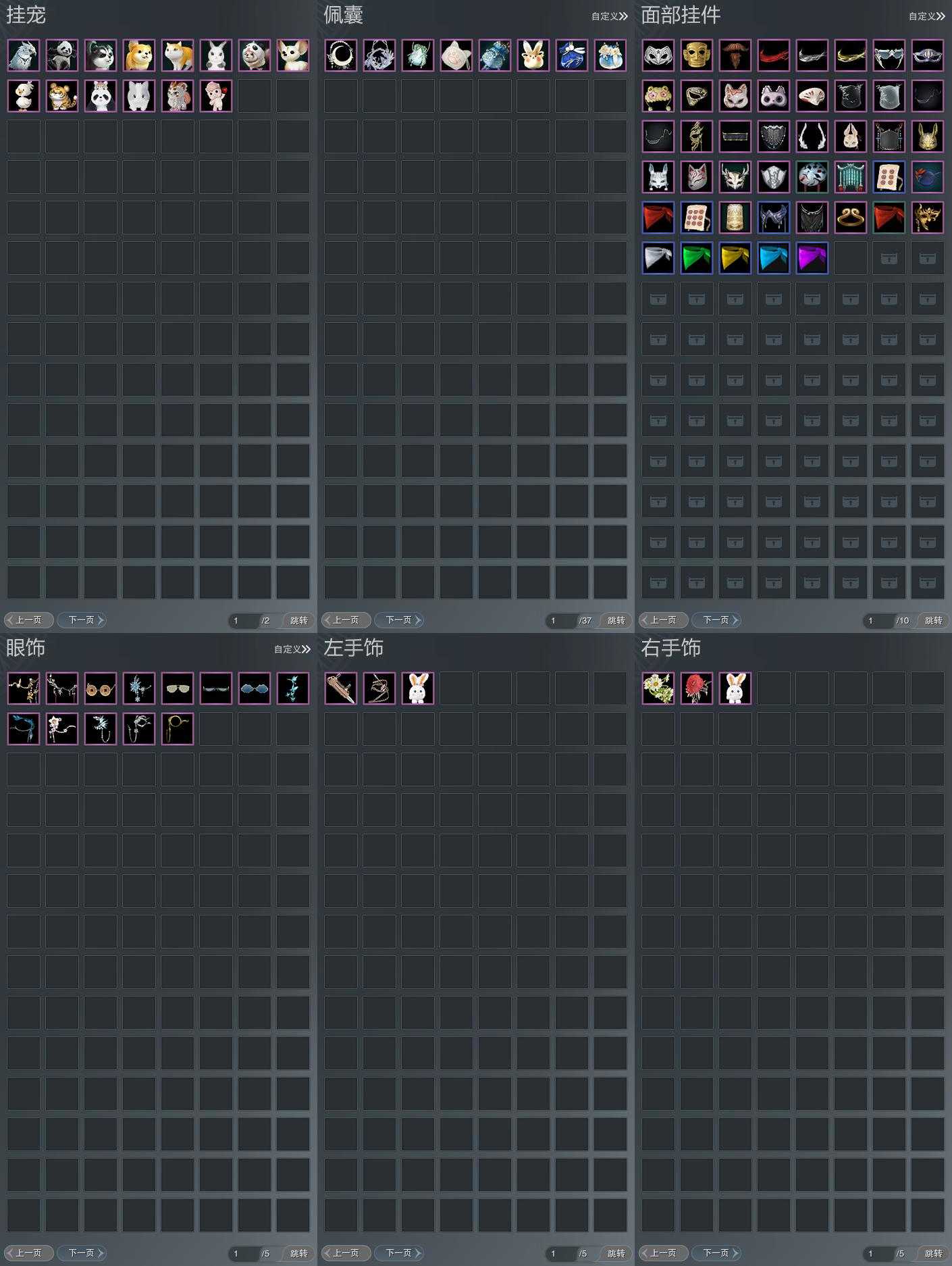 【面挂】45个[镜花浮名, 不见澜生, 珠帘面挂, 金箍, 天妒画颜, 白面具, 祈黎明, 神道狐颜, 玉兔面具, 火兔面具, 蝶影逐春, 兔兔面具, 紫龙角, 清芷凝露, 黑绷带眼罩, 白练眼罩, 夜织眼罩, 破阵面挂, 黑轻云面挂, 白轻云面挂]