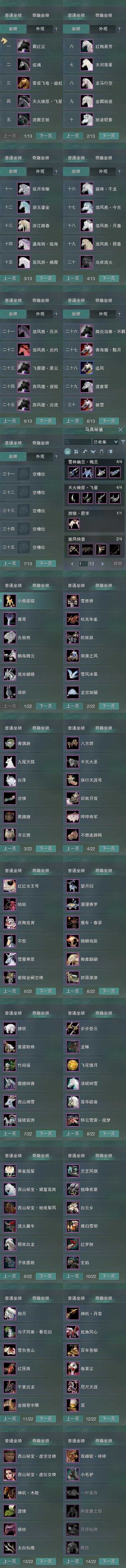 【坐骑】30个[踏炎不羁, 西风瘦炎流, 西风瘦逐狱, 青海骢黯月, 飞霞骠黑云, 黑马, 红马, 小樱马, 雪马, 跃荷马, 金羁驰逐, 白龙马, 弦月马, 天火燎原飞星, 鸾凤游栖霞, 浪风燕今古, 瀛海驹临海, 骁将千龙, 霸红尘, 雷首飞电逾虹]