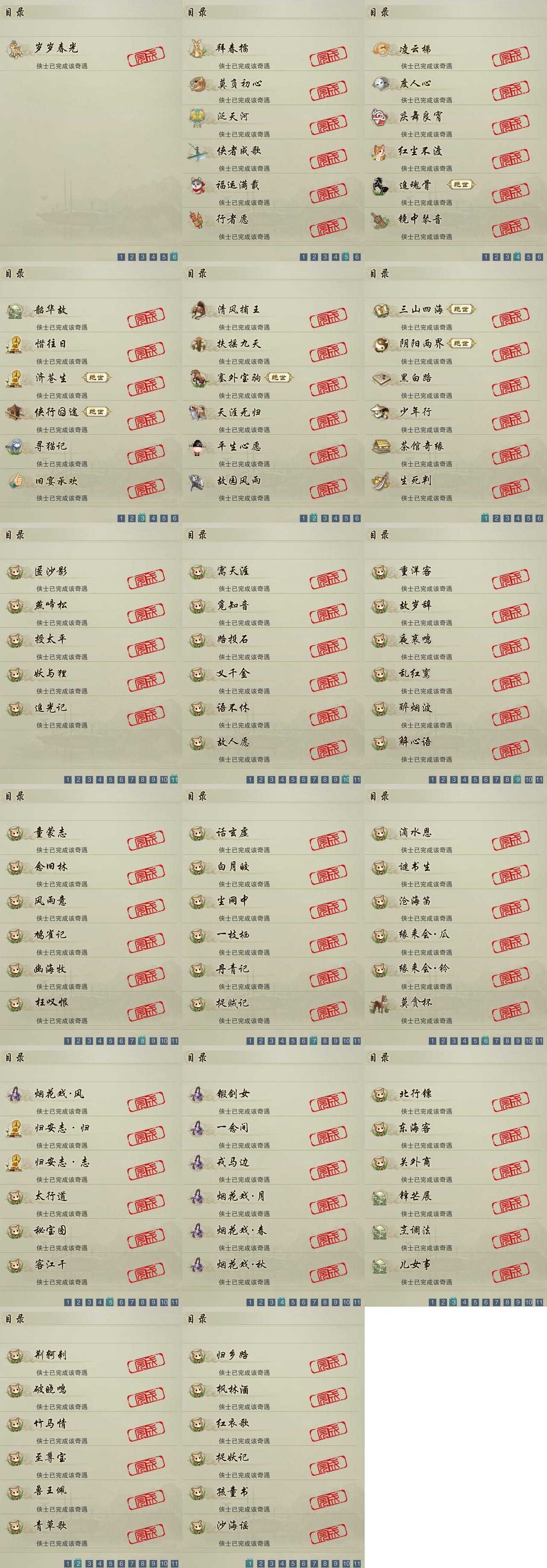 【奇遇】29个[天涯无归, 三山四海, 阴阳两界, 莫负初心, 平生心愿, 黑白路, 惜往日, 塞外宝驹, 韶华故, 济苍生, 少年行, 扶摇九天, 故园风雨, 清风捕王, 侠行囧途, 寻猫记, 茶馆奇缘, 庆舞良宵, 生死判, 凌云梯, 度人心, 追魂骨, 旧宴承欢, 泛天河, 镜中琴音, 侠者成歌, 红尘不渡, 拜春擂, 福运满载]