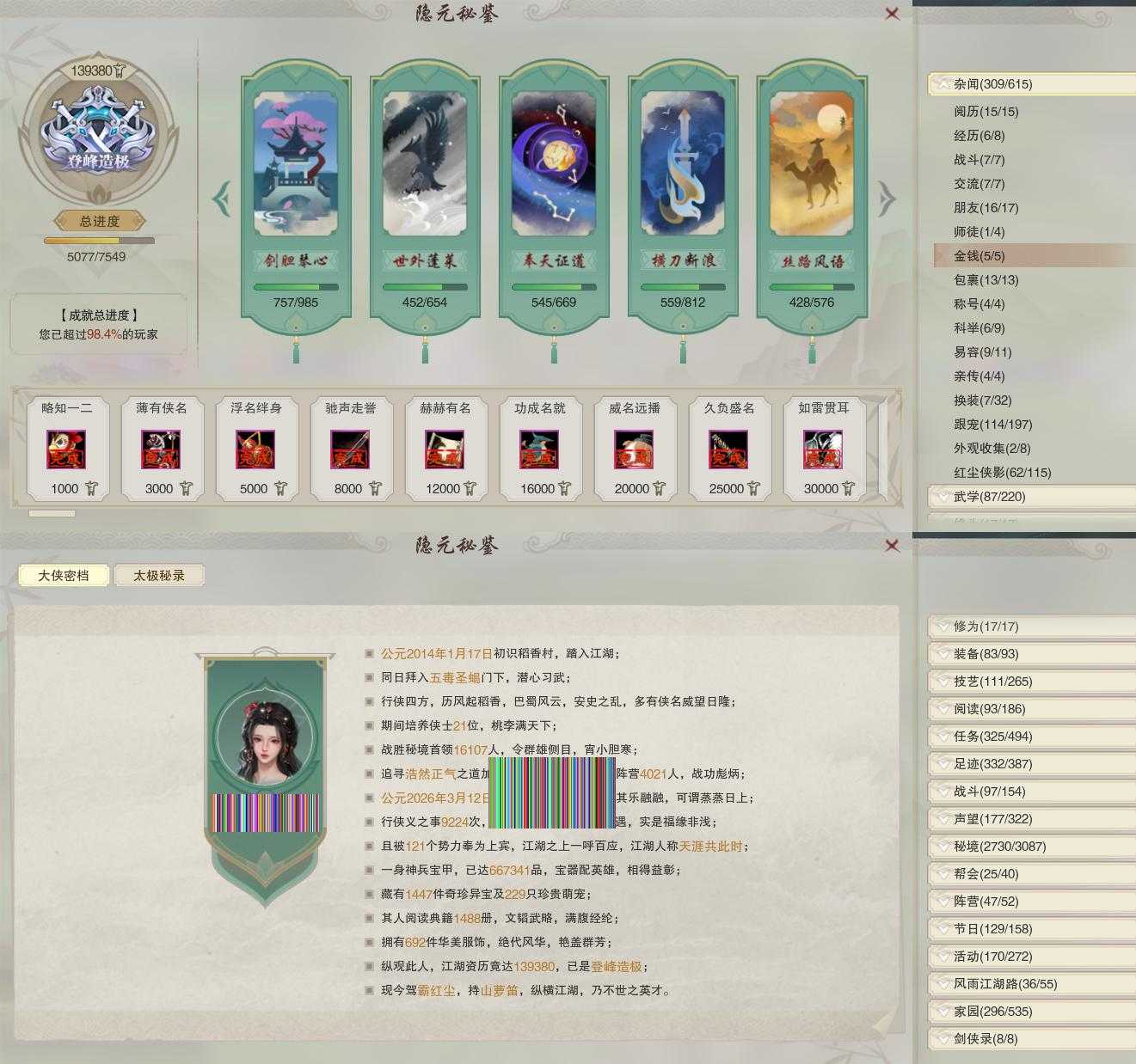 【同伴】沐晴柔90级境界壹,月嘉禾86级境界壹,李逍遥86级境界伍,唐小珂85级境界壹,沈剑心85级境界壹,李星云85级境界壹,康宴别84级境界壹,白鹊慈84级境界壹,贺闲意83级境界壹,盖聂83级境界壹,姜棠意81级境界壹,卫庄志80级境界壹,燕子娘75级境界壹,赵灵儿74级境界壹,阮闲舟73级境界壹,年小熊71级境界壹,温辞秋63级境界壹,李萼志61级境界壹,温折枝60级境界壹,年小鹿60级境界壹,阮归云60级境界壹,茸茸志60级境界壹,费大劲60级境界壹