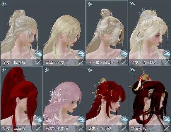 【发型】金发4个[狐金, 玄江金发, 蛇金, 紫月下金发], 红发4个[蝶粉, 鸡红, 蛇红, 马红], 黑发7个, 白发6个, 盒子发型[紫月下黑发, 白蛇盒黑发, 白蛇盒白发, 蓝寻香黑发, 瑶华盒黑发, 瑶华盒白发], 总页数3