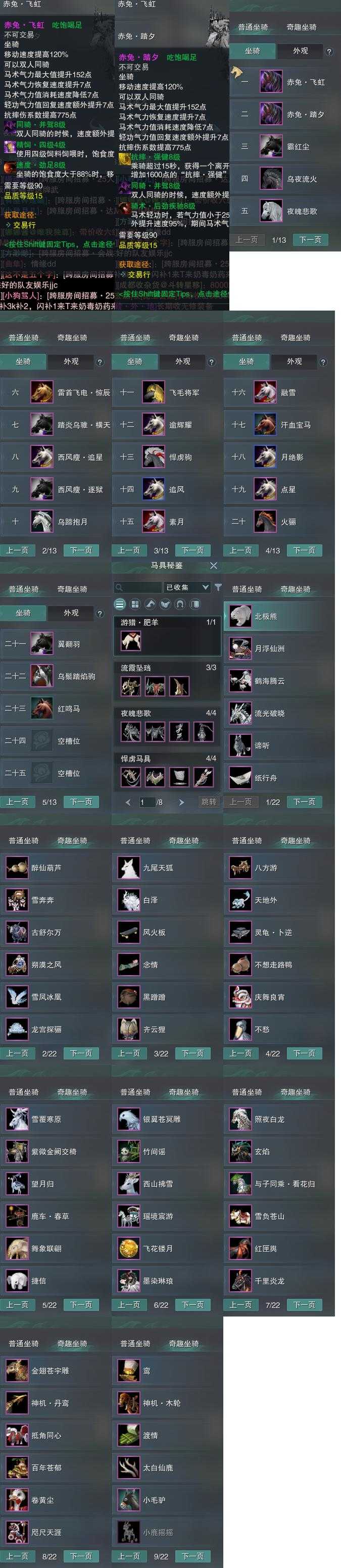 【坐骑】23个[踏炎横天, 西风瘦逐狱, 西风瘦追星, 飞毛将军, 乌蹄抱月, 劲足赤兔飞虹, 赤兔踏夕, 黑翅马, 霸红尘, 雷首飞电惊辰, 乌鬃踏焰驹]