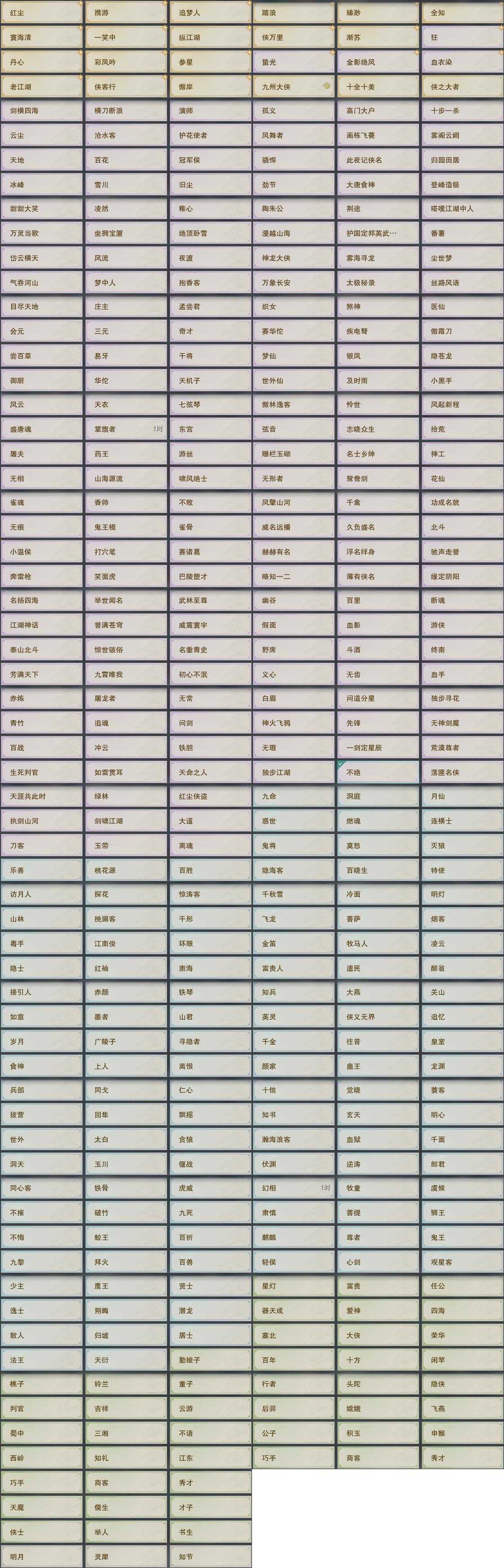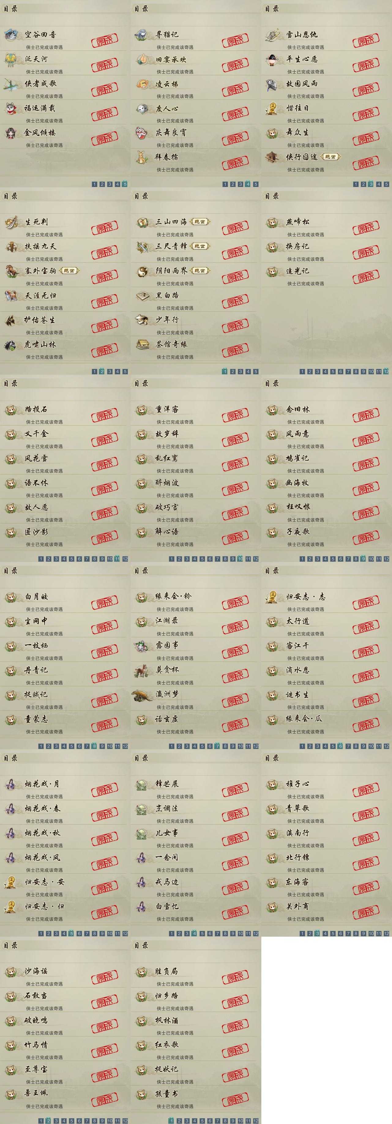 【奇遇】29个[天涯无归, 三山四海, 雪山恩仇, 阴阳两界, 平生心愿, 黑白路, 惜往日, 塞外宝驹, 虎啸山林, 护佑苍生, 少年行, 故园风雨, 扶摇九天, 三尺青锋, 舞众生, 寻猫记, 侠行囧途, 茶馆奇缘, 庆舞良宵, 生死判, 凌云梯, 度人心, 空谷回音, 旧宴承欢, 泛天河, 侠者成歌, 拜春擂, 福运满载, 金风倾楼]