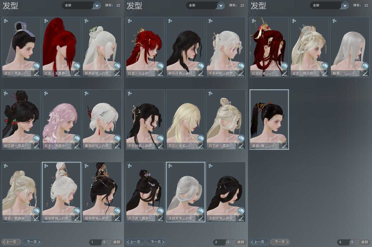 【发型】金发4个[狐金, 玄江金发, 蛇金, 紫月下金发], 红发4个[蝶粉, 鸡红, 蛇红, 马红], 黑发7个, 白发6个, 盒子发型[紫月下黑发, 白蛇盒黑发, 白蛇盒白发, 蓝寻香黑发, 瑶华盒黑发, 瑶华盒白发], 总页数3