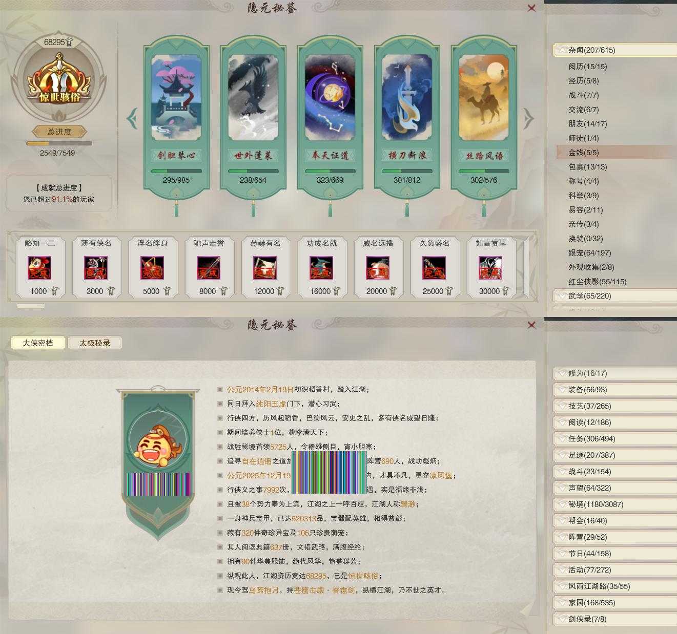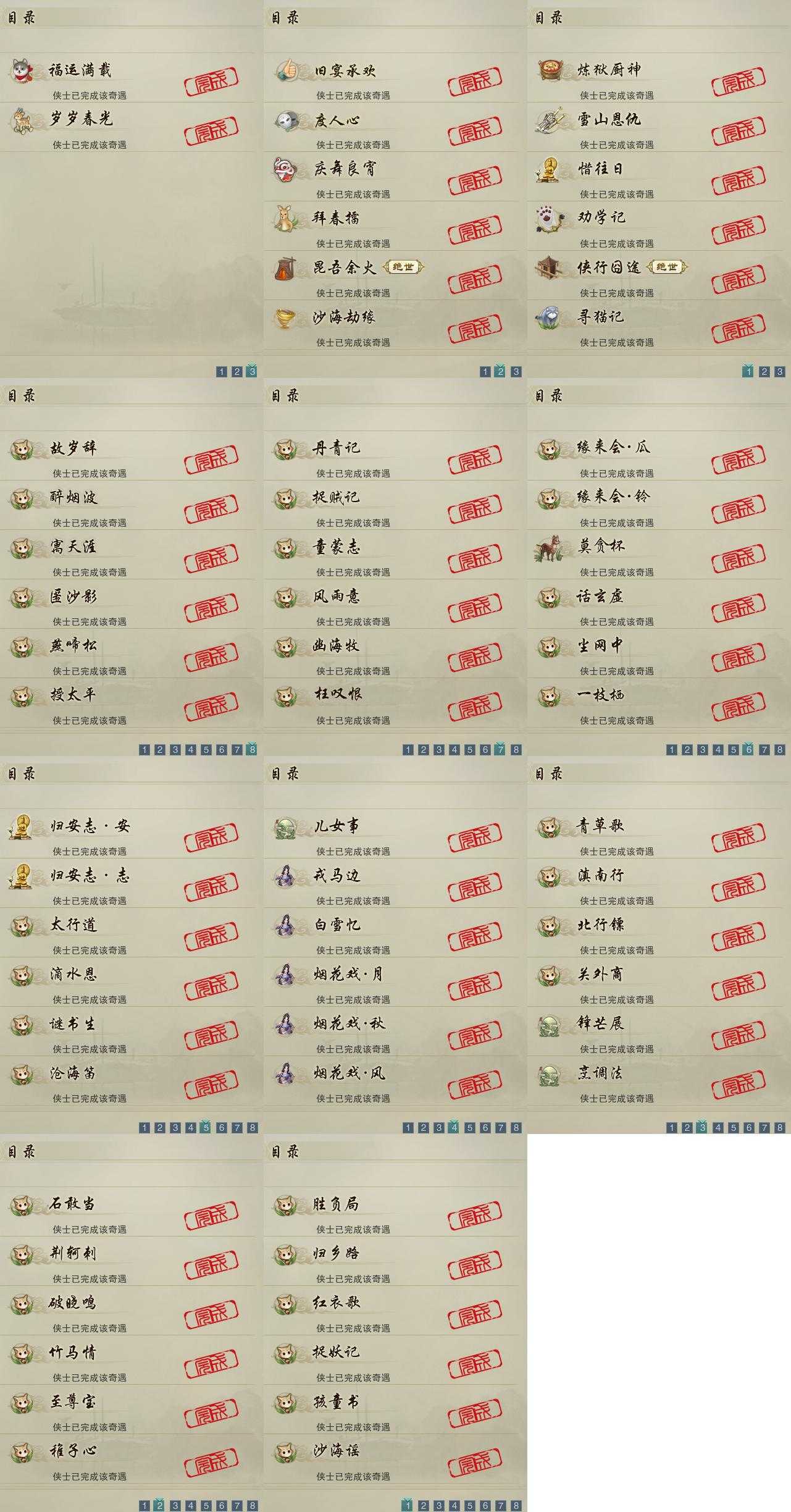 【奇遇】13个[雪山恩仇, 劝学记, 惜往日, 侠行囧途, 寻猫记, 庆舞良宵, 炼狱厨神, 度人心, 旧宴承欢, 昆吾余火, 拜春擂, 沙海劫缘, 福运满载]