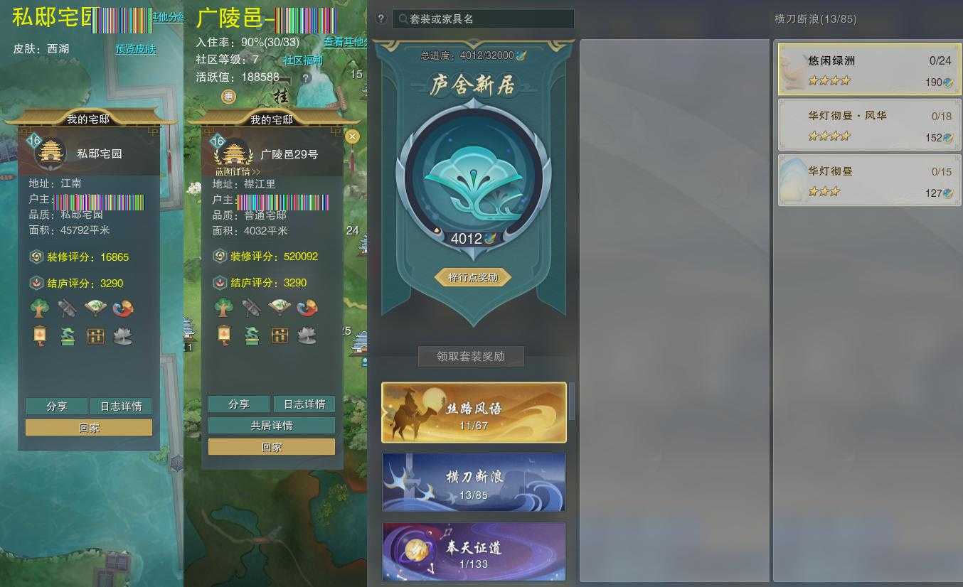 【家园】房屋等级16,社区等级7,私邸宅园,梓行点4012