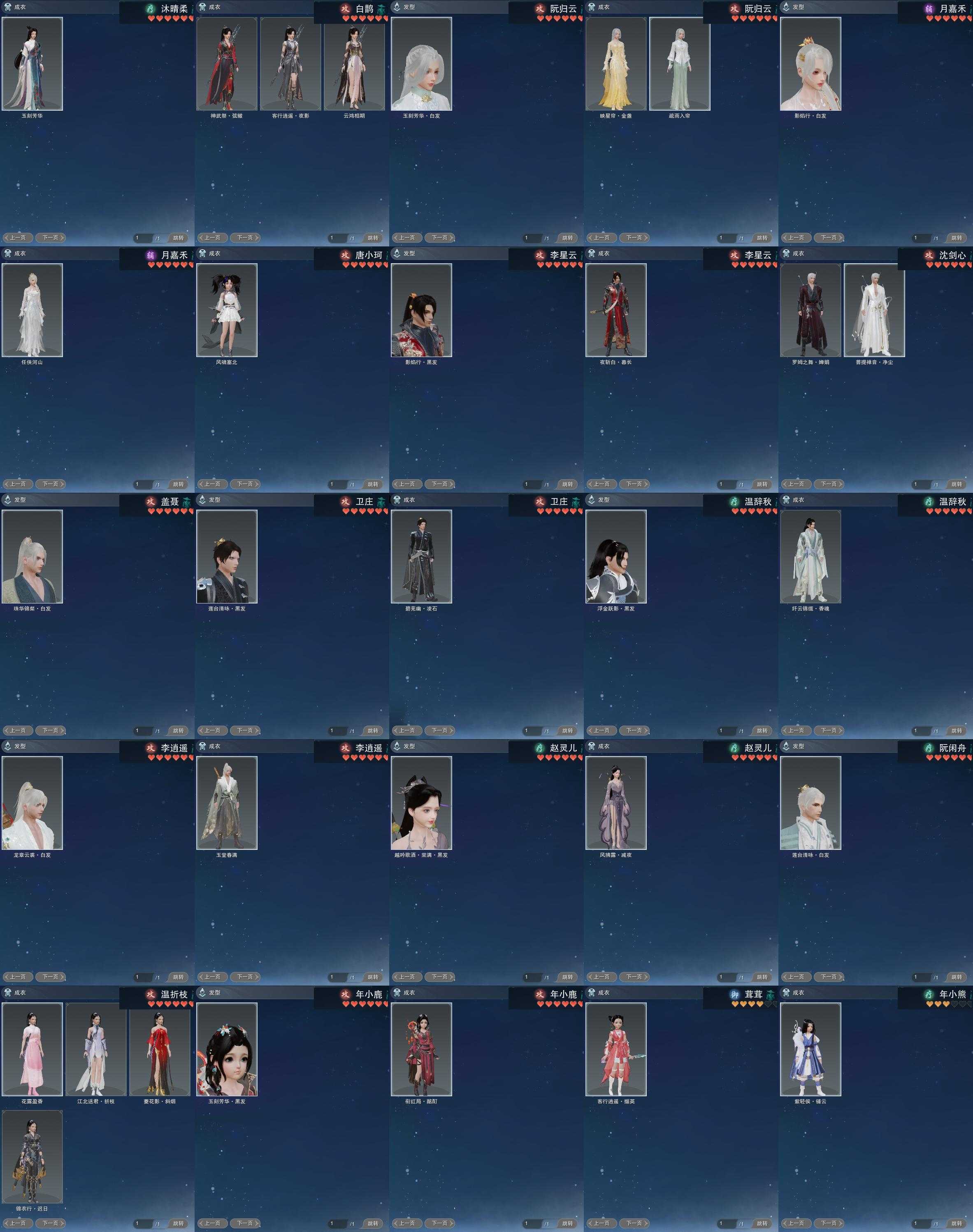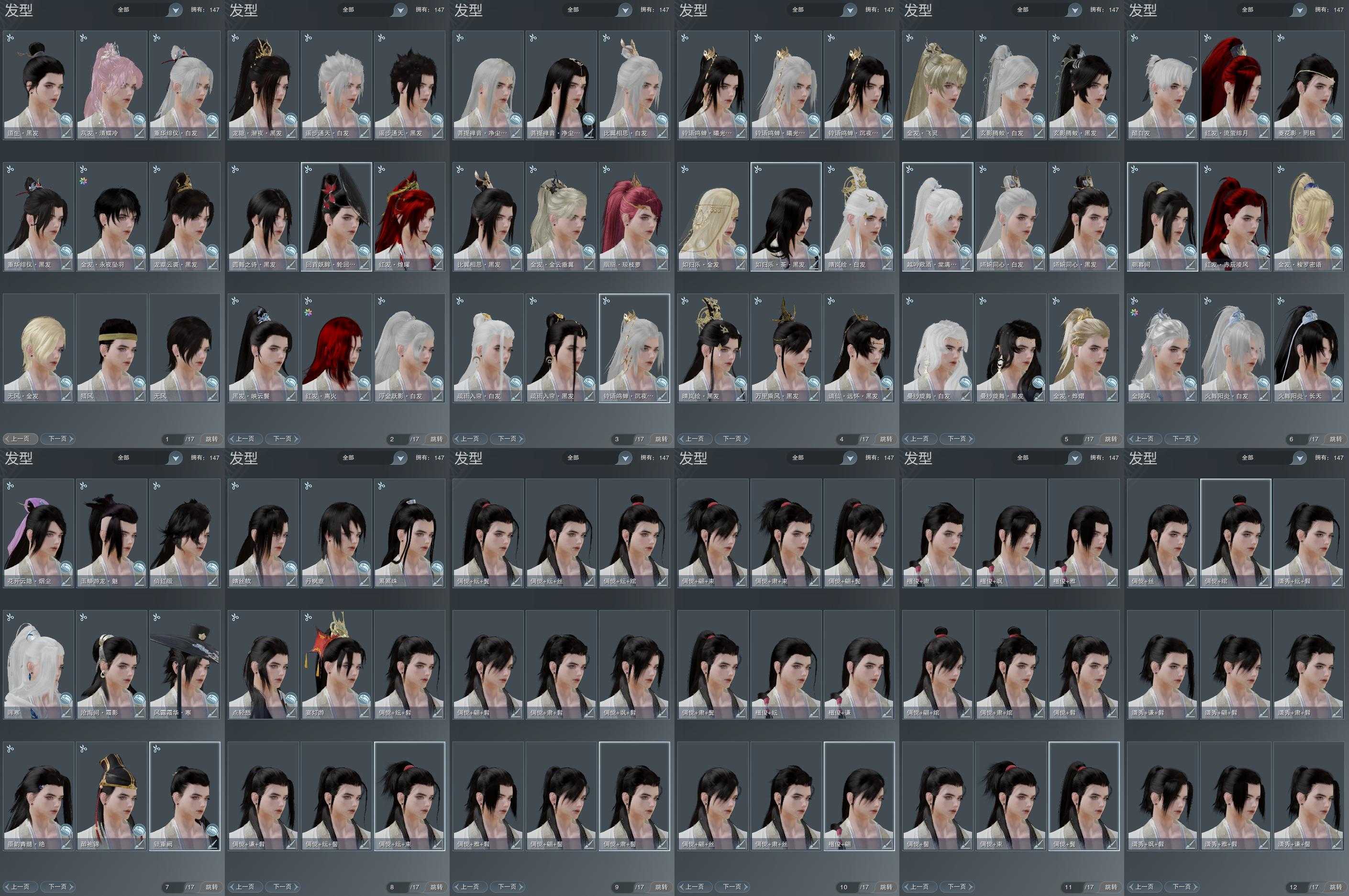【发型】金发8个[一代金, 资历金, 猪金, 飒金, 苍金, 如归金, 无风金发, 永夜金], 红发6个[八红, 紫发, 蝶粉, 兔红, 小资历红, 大资历红], 黑发41个, 白发21个, 盒子发型[丝路黑, 四代七夕黑发, 四代中秋粉黑发, 小白龙黑发, 黑谪仙黑发, 乘风黑发, 晴岚绘黑发, 白楼兰黑发, 黑楼兰黑发, 丝路白, 澡盒黑发, 四代七夕白发, 四代中秋粉白发, 五代七夕黑发, 小白龙白发, 晴岚绘白发, 白楼兰白发, 黑楼兰白发, 净尘黑发, 澡盒白发, 五代七夕白发, 净尘白发, 小金龙黑发, 小金龙白发, 红黑妖眸盒黑发, 圆舞盒黑发, 西游盒黑发, 西游盒白发, 黑龙隐黑发, 莲台盒黑发, 镰刀黑发, 莲台盒白发, 镰刀白发, 墨龙盒黑发, 墨龙盒白发], 总页数12