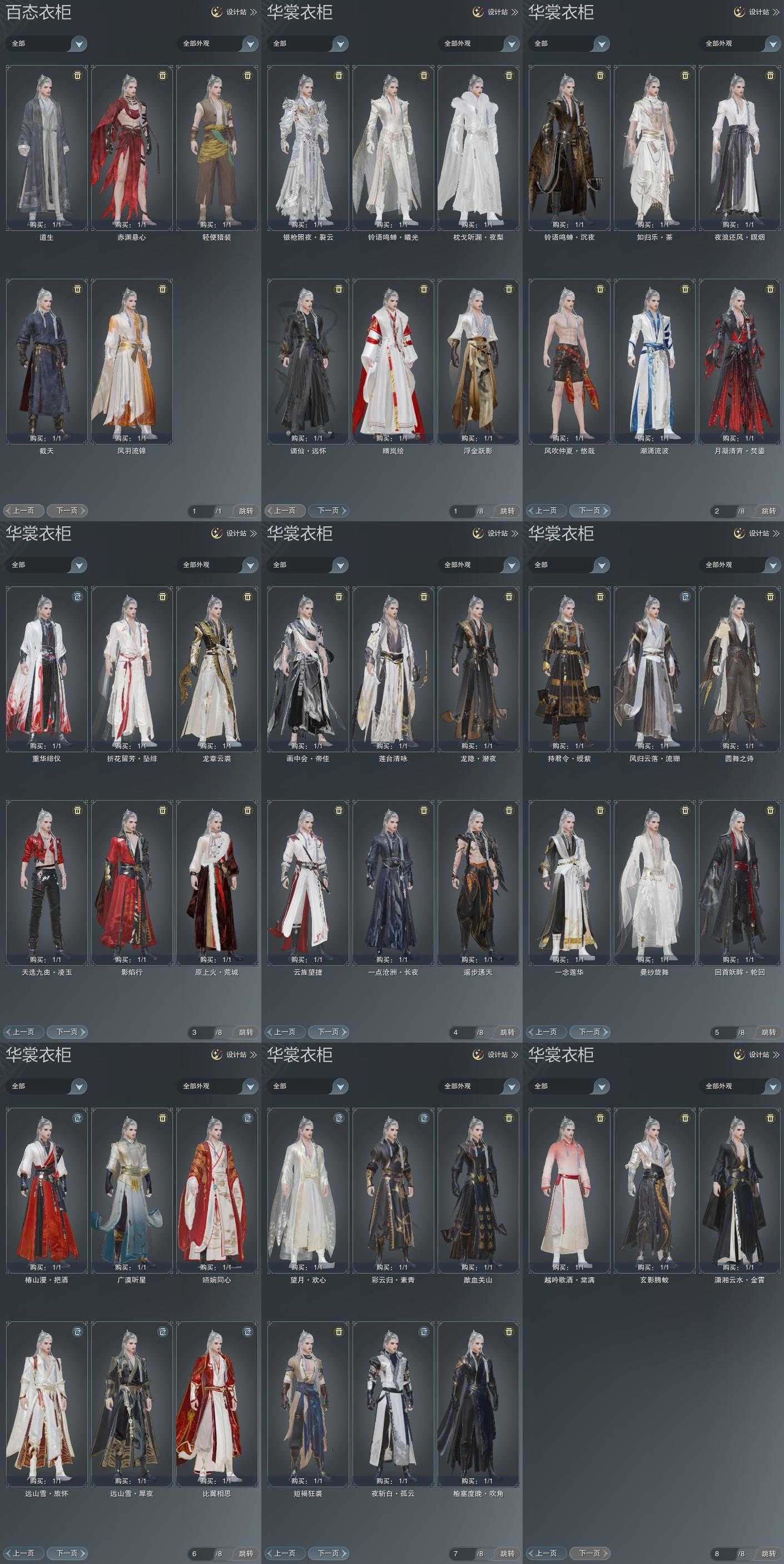 单盒成衣:[黑谪仙衣, 红椿山衣, 黑沧洲盒衣, 紫持君衣, 黑上火, 潮涌盒衣]