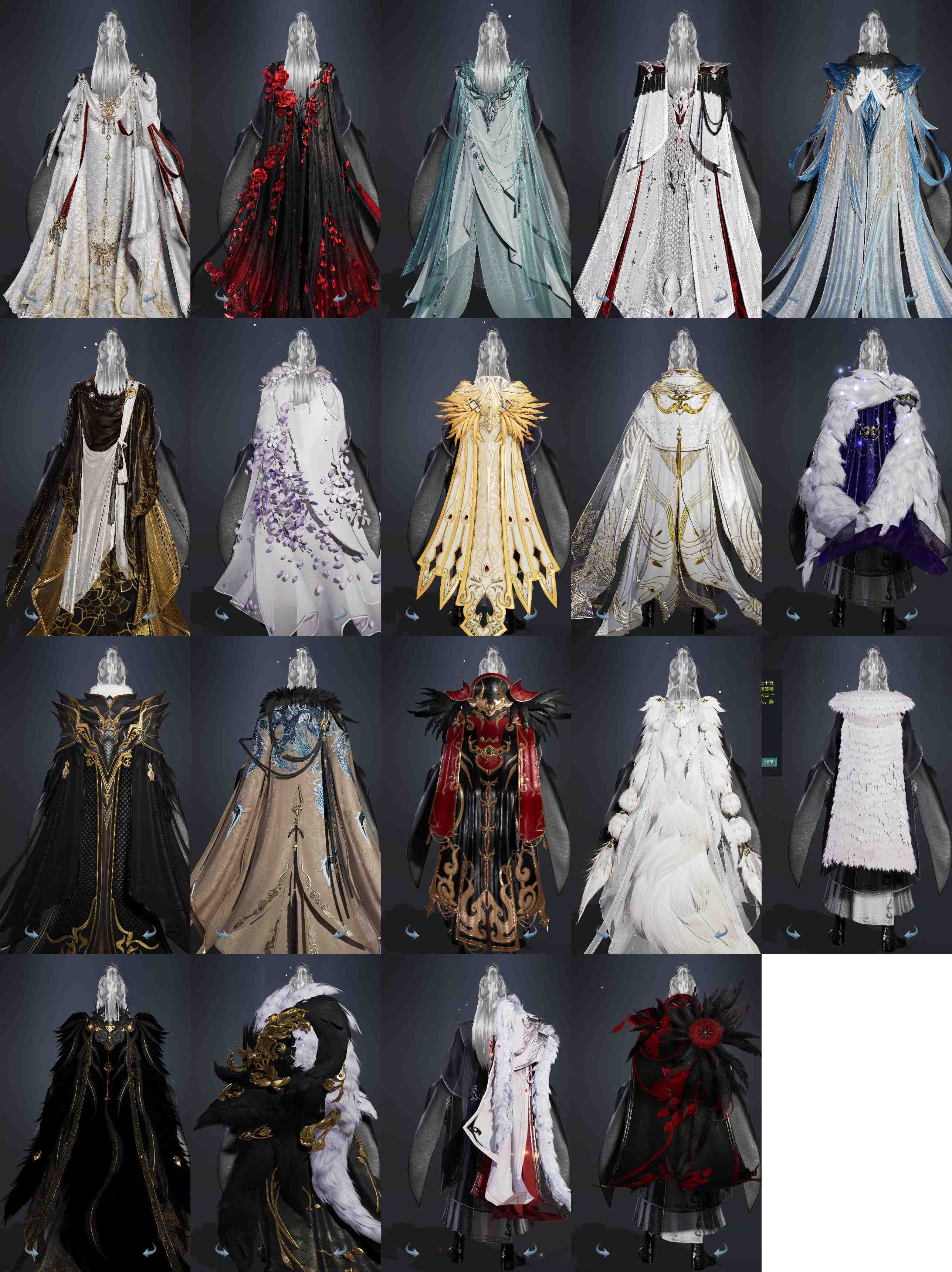 【披风】20个,[7W资历披风, 情R枕, 14W资历披风, 战服恶人, 三山披风, 奇遇披风, 苍盒子披风, 丐盒子披风, 星演披风, 刀宗盒披风, 莲华盒披风, 策二披风, 白赵云披风, 顺毛, 八周黑, 黑狐裘, 白狐裘, 云麒赫奕, 赤庭葳蕤]