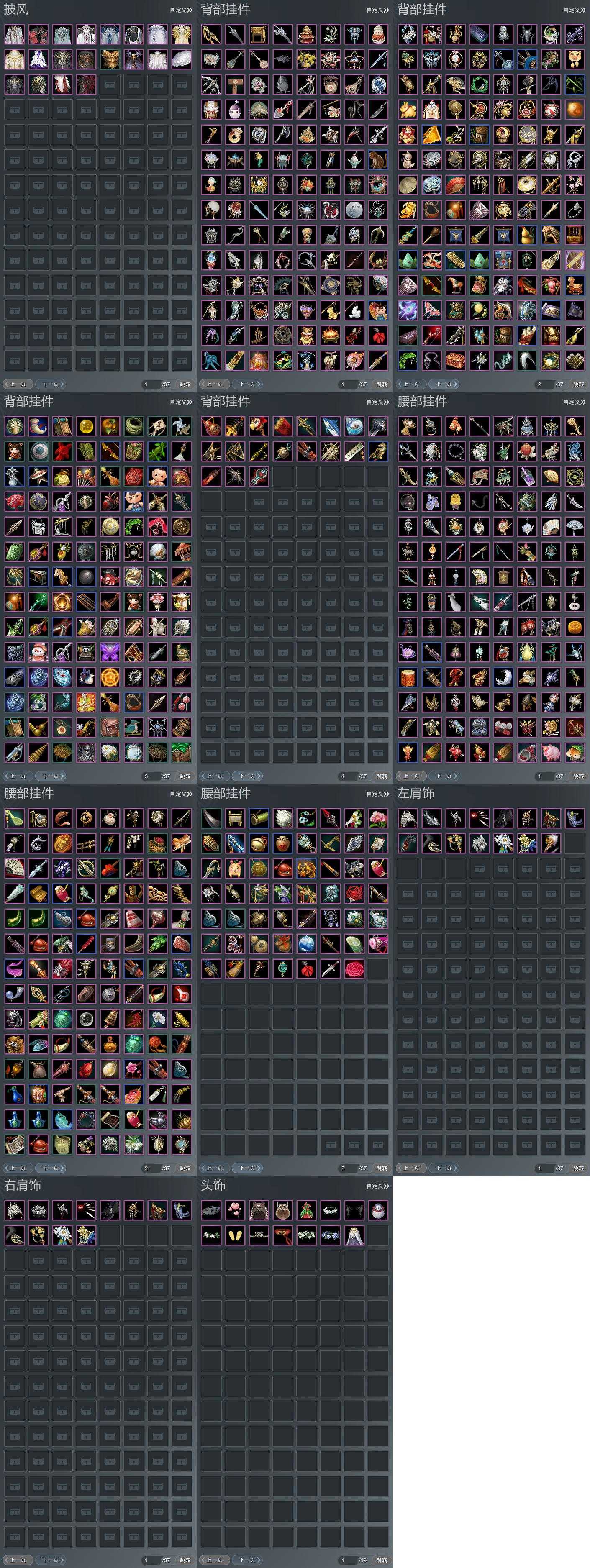 【背挂】355个[阴阳剑, 红黑白路, 毽子, 凤鸣梧枝, 红纶苍鬓, 冰壶咽·霜月, 幽篁栖桐·远怀, 石剑溟灵, 识妆, 白楼兰伞, 黑楼兰伞, 白玉青璃灯, 五七盒挂件, 小金龙挂件, 弓盒挂件, 白玄玉挂件, 蓝钻石盒挂件, 踏青挂件, 圆舞盒挂件, 莲台盒背挂]