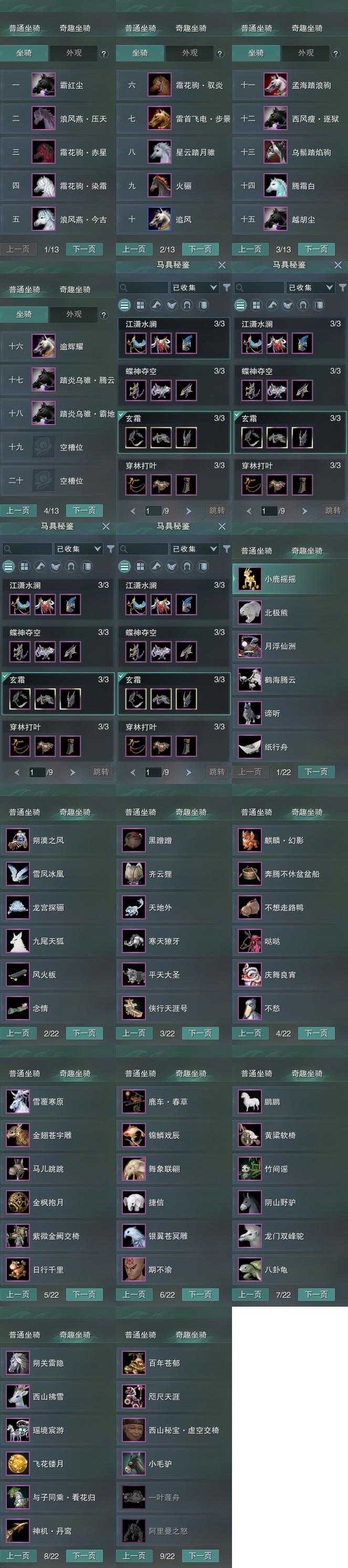【坐骑】18个[踏炎腾云, 踏炎霸地, 西风瘦逐狱, 星云踏月骓, 霜花驹染霜, 霜花驹赤星, 霜花驹驭炎, 浪风燕今古, 霸红尘, 雷首飞电步景, 乌鬃踏焰驹]
