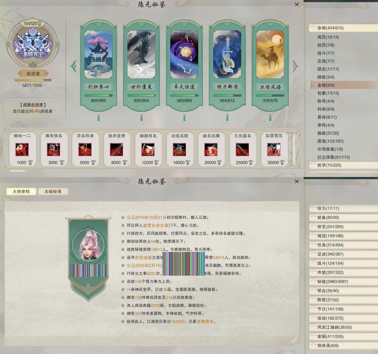 【奇遇】39个[天涯无归, 三山四海, 劝学记, 雪山恩仇, 阴阳两界, 兔江湖, 平生心愿, 黑白路, 乱世舞姬, 惜往日, 塞外宝驹, 争铸吴钩, 韶华故, 虎啸山林, 济苍生, 少年行, 故园风雨, 扶摇九天, 三尺青锋, 流年如虹, 舞众生, 寻猫记, 侠行囧途, 茶馆奇缘, 庆舞良宵, 生死判, 千秋铸, 凌云梯, 炼狱厨神, 赴九幽]