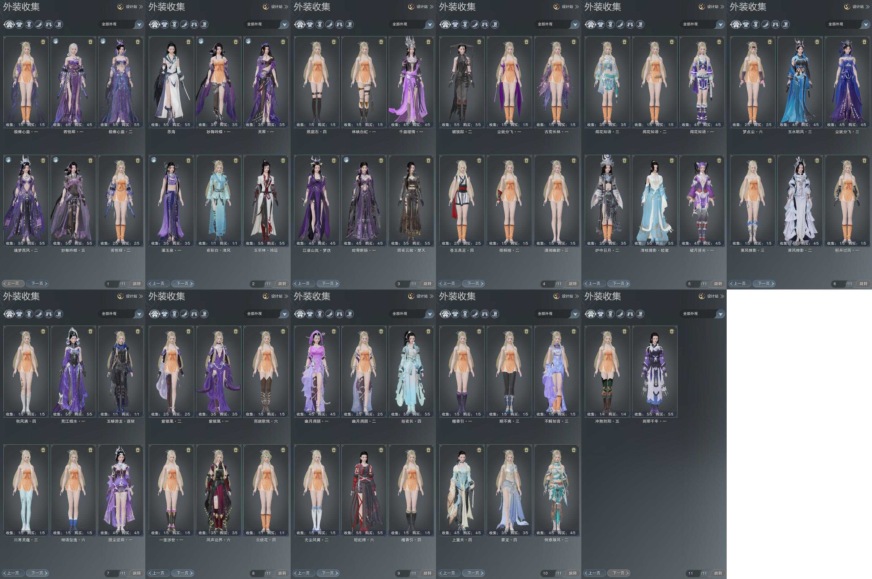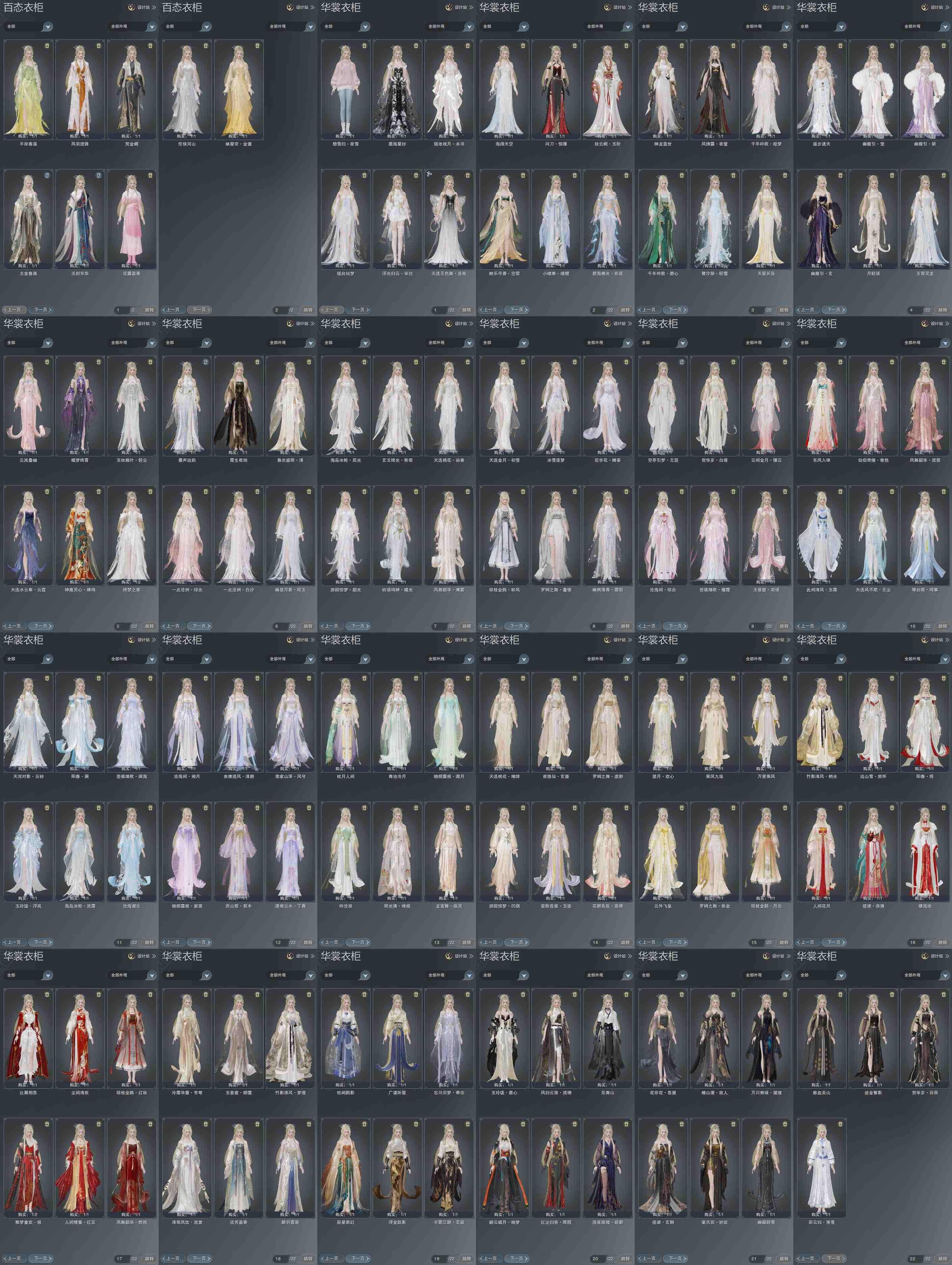 单盒成衣:[一代乘风衣, 蓝玲珑衣, 白凤舞衣, 白六七盒衣, 灰竹影衣, 红人间盒衣, 白幽昙衣, 白雪人衣, 黑椿山衣, 紫沧洲盒衣, 白幽馥衣, 紫幽馥衣, 黑幽馥衣, 天星盒衣, 婚纱衣, 原色鹿衣, 粉鹿衣, 海阔盒衣, 熊猫盒衣, 青蛇盒衣, 绿寻香盒衣, 红问刀, 魔镜盒衣]