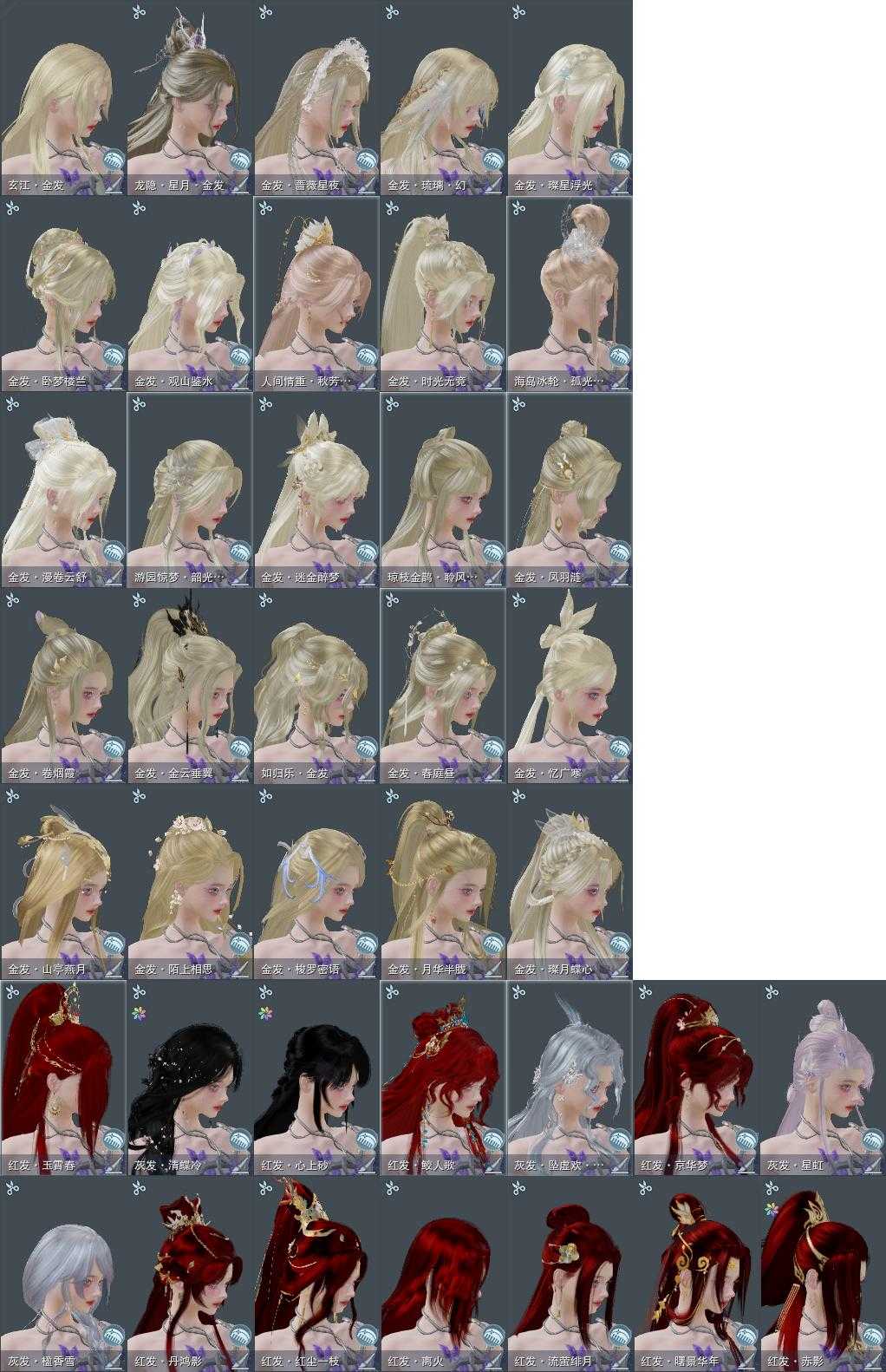 【发型】金发25个[狐金, 兔金, 资历金, 鼠金, 鸡金, 考金, 国金, 苍金, 如归金, 角金, 凤金, 时光金, 牛金, 云金, 呱金, 女仆金, 雪金, 海金, 蔷薇金, 玄江金发, 白琼枝金发, 白游园金发, 白海岛金发, 黄人间金发, 紫龙隐金发], 红发14个[五红, 十二红, 蝶粉, 猴红, 虎红, 小资历红, 龙红, 大资历红, 十五红, 蛇红, 马红, 二代灰, 一代灰, 三代灰银], 黑发87个, 白发47个, 盒子发型[绿盒黑发, 紫盒黑发, 晴岚绘黑发, 雪月白发, 山吹樱雪黑发, 白楼兰黑发, 澡盒黑发, 飞皇黑发, 幽阑黑发, 同人黑发, 绿盒白发, 二代乘风黑发, 紫盒白发, 五代七夕黑发, 晴岚绘白发, 黑同人黑发, 白楼兰白发, 墨心黑发, 澡盒白发, 飞皇白发, 幽阑白发, 同人白发, 月轻语黑发, 二代乘风白发, 五代七夕白发, 烨然黑发, 流萤黑发, 蓝曲塘黑, 澄琼枝黑发, 黑同人白发, 白琼枝黑发, 墨心白发, 红琼枝黑发, 沧海黑发, 唐风玉壶黑发, 黑红尘黑发, 月轻语白发, 黑狮黑发, 绿游园黑发, 蓝曲塘白, 白游园黑发, 紫幽香黑发, 沧海白发, 小金龙黑发, 唐风玉壶白发, 黑红尘白发, 黑狮白发, 白明光黑发, 竹笛黑发, 孔雀黑发, 紫幽香白发, 小金龙白发, 十二黑, 芙蓉黑发, 六代中秋黑发, 二胡黑发, 白海岛黑发, 白明光白发, 竹笛白发, 蓝海岛黑发, 孔雀白发, 竹影梢光黑发, 芙蓉白发, 六代中秋白发, 二胡白发, 蓝异域黑发, 黑懒猪黑发, 红懒猪黑发, 蓝异域白发, 绿水袖白发, 花滑黑发, 紫忘川黑发, 紫人间黑发, 黄人间黑发, 花滑白发, 星辰黑发, 狼盒黑发, 紫忘川白发, 紫雨山前黑发, 星辰白发, 狼盒白发, 竹露响霜色黑发, 幽涧愀兮白发, 蓝傣族黑发, 除夕盒黑发, 蓝钻石盒黑发, 蓝椿山黑发, 灵龙盒黑发, 粉沧洲盒黑发, 西游盒黑发, 白持君盒黑发, 灵龙白发, 白八中黑发, 六代重阳黑发, 西游盒白发, 天星盒黑发, 白八中白发, 紫龙隐黑发, 婚纱盒黑发, 粉鹿黑发, 蓝鹭黑发, 梦盒黑发, 九七黑发, 白蛇盒黑发, 白蛇盒白发, 燕月盒黑发, 白千山白发, 白战国黑发, 白浮光黑发, 瑶台仙梦黑发, 白波斯黑发, 瑶台仙梦白发, 粉毛衣黑发], 总页数20
