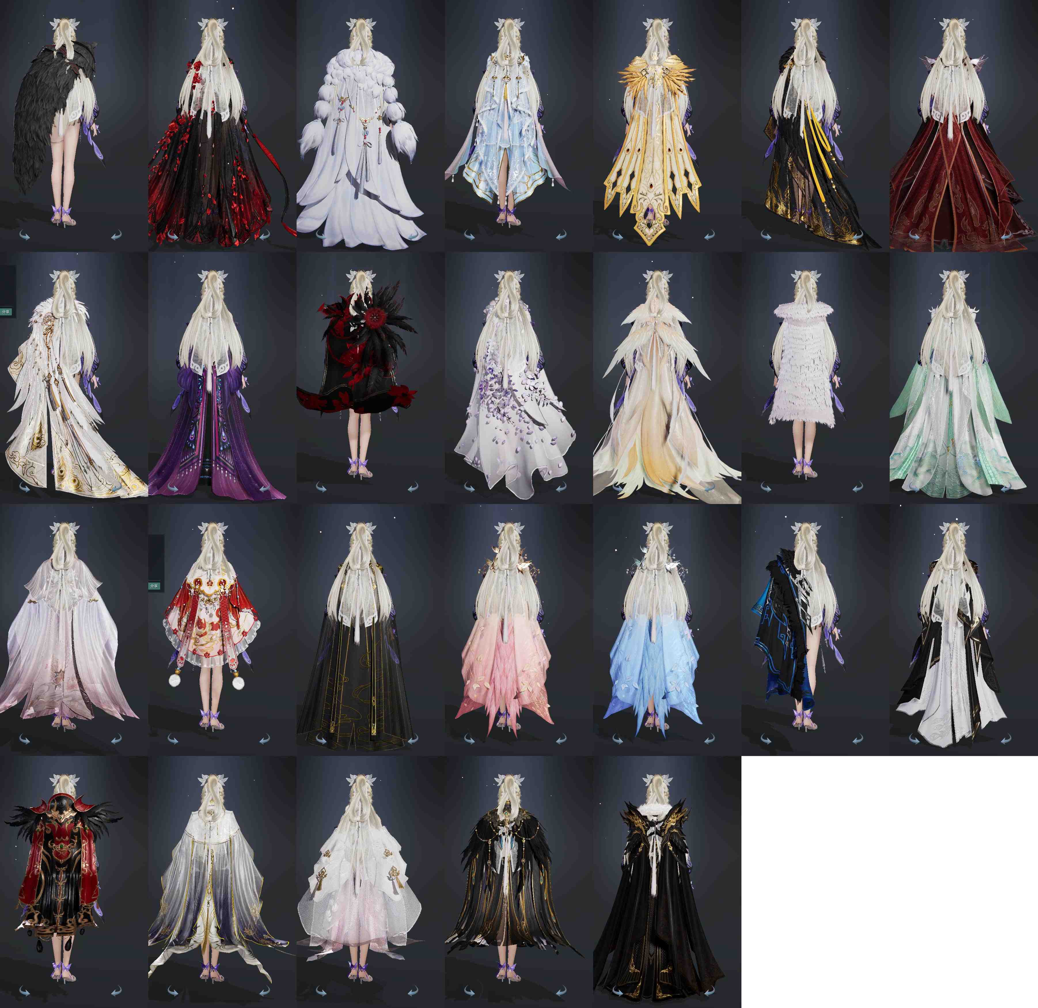 复刻:[罗姆烁金, 望月欢心, 罗姆叠银, 沧海间湘月, 沧海间琼台, 彩云归落雪, 白贺华岁, 阳春烬, 阳春澜, 复刻紫水云, 复刻白二娃, 瑶池戏月未书, 白二公主, 天选黑无色, 黄二公主, 复刻蓝不欺, 远山雪旅怀, 谁家风兮, 龙鸾舞振灵, 花非花晴荼, 五期福袋成衣, 花非花苍黛, 夜隐仙玄葵, 紫潇湘, 粉仙侣, 风拂露夜璧]
