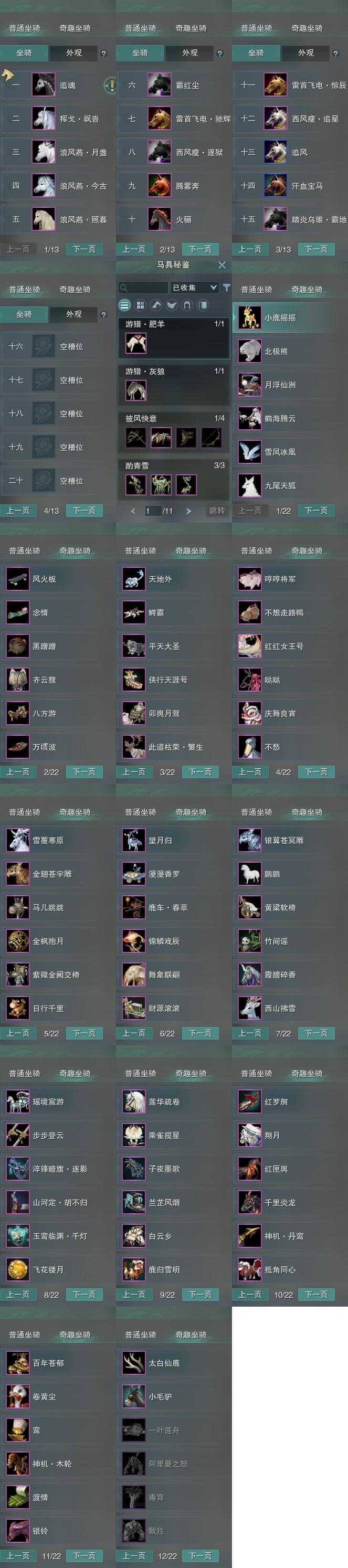 【坐骑】15个[踏炎霸地, 西风瘦逐狱, 西风瘦追星, 挥戈飒沓, 浪风燕今古, 霸红尘, 雷首飞电惊辰, 雷首飞电驰辉]