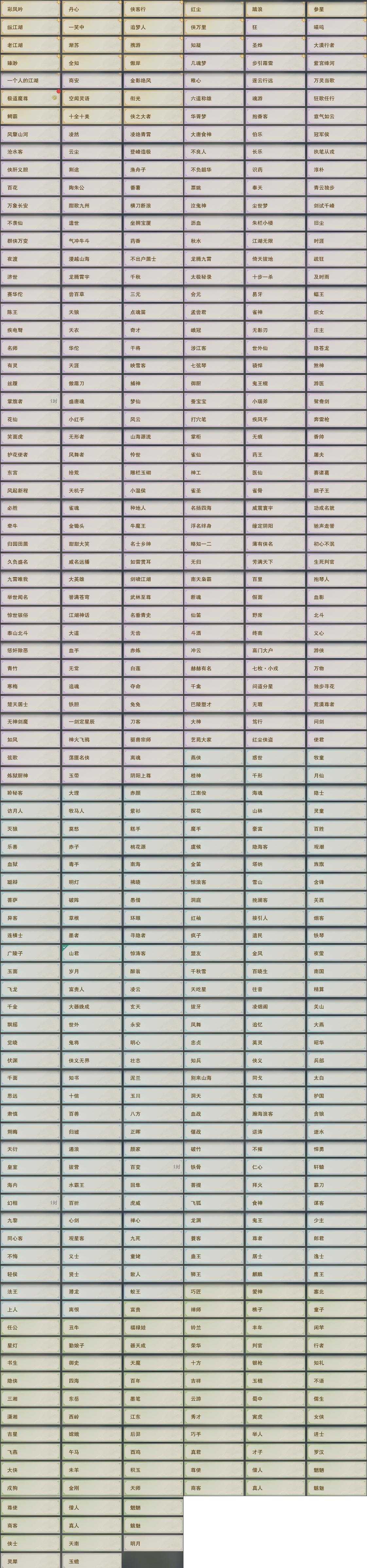 【称号】[紫宫绛河, 知凝, 纵江湖, 侠万里, 几魂梦]