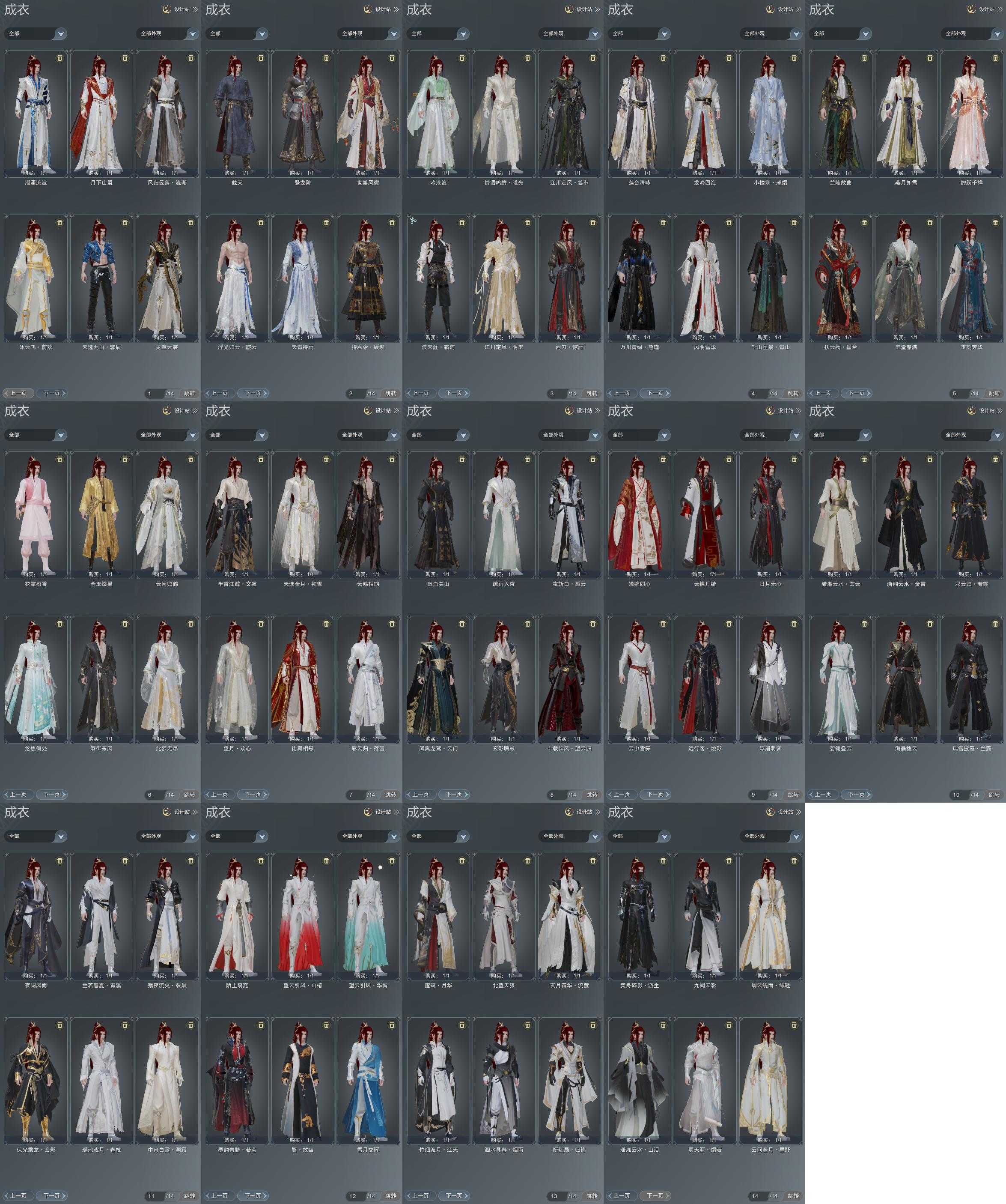 限时限量:[红云飞, 望云山椿, 霆螭月华, 望云华胥, 中宵渊霜, 兰若青溪, 烟花套, 十二周年工作服, 小黑龙衣, 一期福袋成衣, 十三周年成衣, 万川青绿黛瑾, 十四周年工作服, 云闲归鹤, 浪天涯霜河]