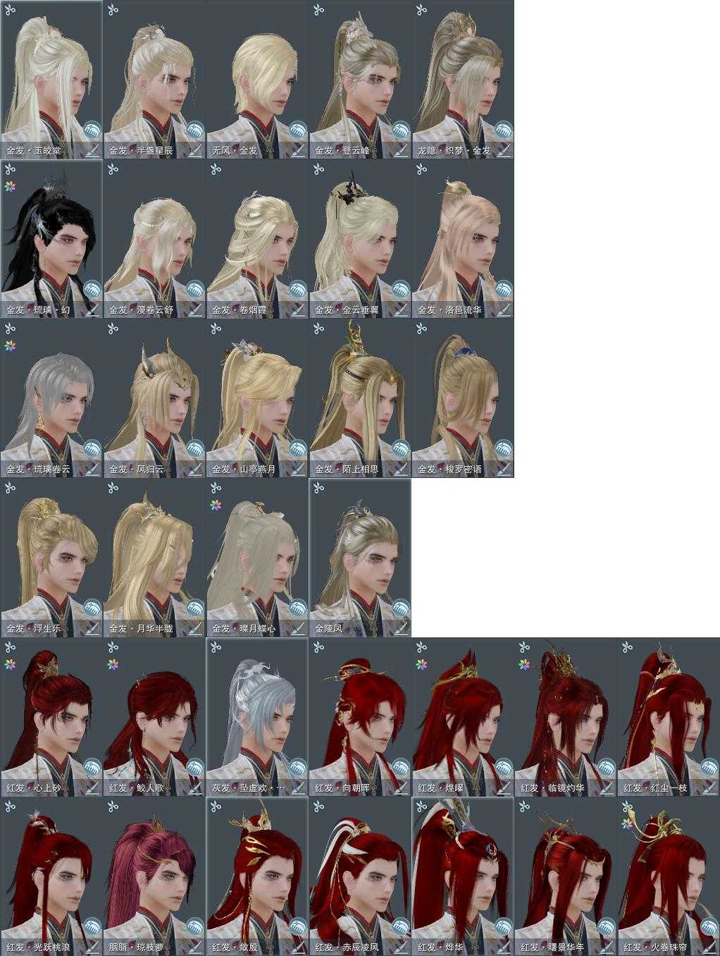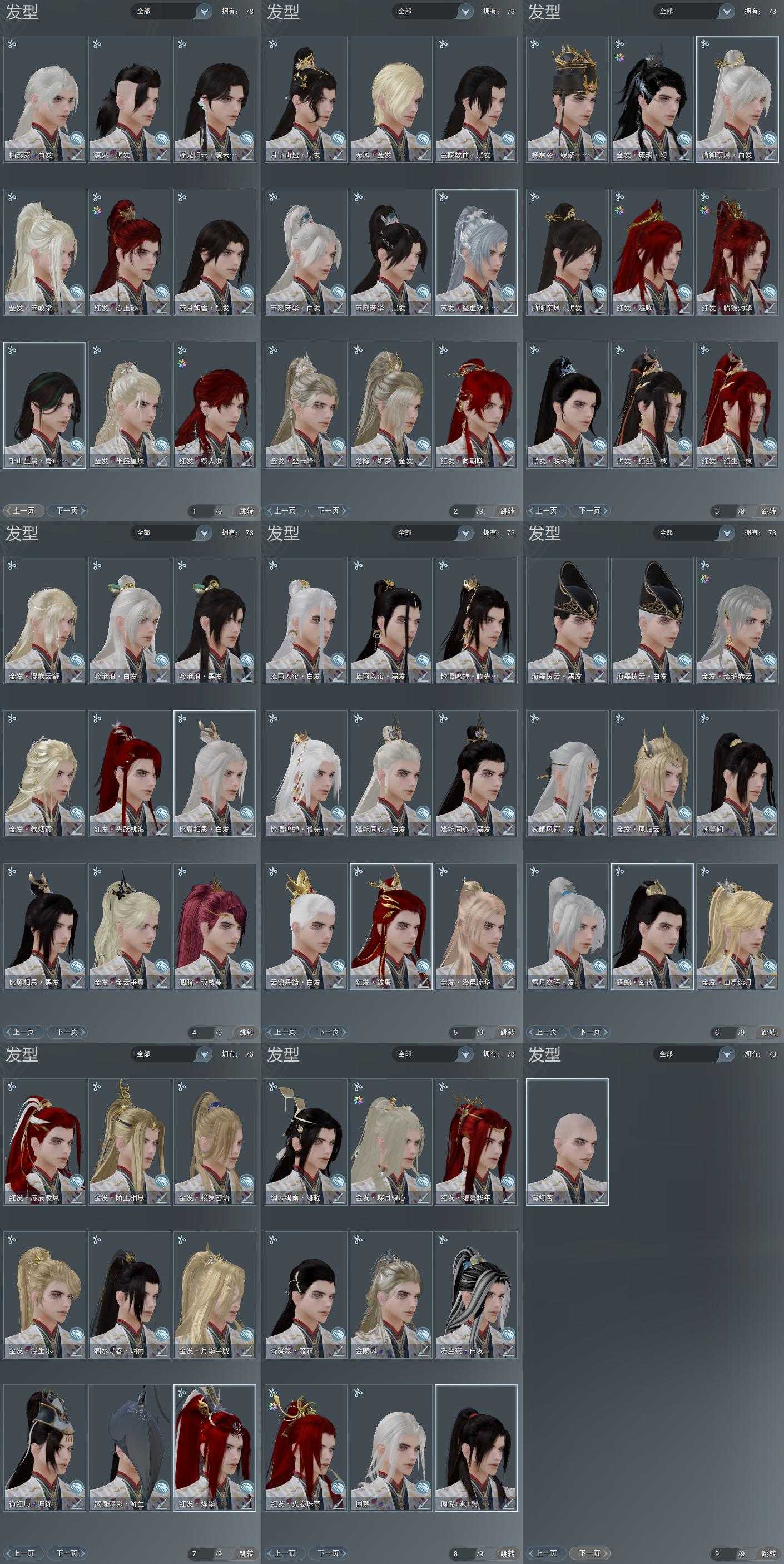 【发型】金发19个[一代金, 狐金, 资历金, 鸡金, 喵金, 考金, 国金, 狗金, 龙女金, 玫瑰金, 苍金, 角金, 云金, 海金, 三代金, 无风金发, 精灵金, 七中金发, 白龙隐金发], 红发14个[六红, 七红, 八红, 十一红, 十二红, 十三红, 十四红, 紫发, 猴红, 猪红, 兔红, 十五红, 蛇红, 三代灰银], 黑发27个, 白发14个, 盒子发型[狄仁杰黑, 四代七夕黑发, 黑端午白发, 狄仁杰白, 二代元宵白, 雪月白发, 白楼兰黑发, 澡盒黑发, 四代七夕白发, 五代七夕黑发, 白楼兰白发, 澡盒白发, 五代七夕白发, 竹笛黑发, 十二黑, 竹笛白发, 卿酒盒黑发, 卿酒盒白发, 紫持君盒黑发, 兰陵盒黑发, 九七黑发, 绿千山黑发, 燕月盒黑发, 墨龙盒黑发, 黑战国黑发, 蓝浮光黑发], 总页数9
