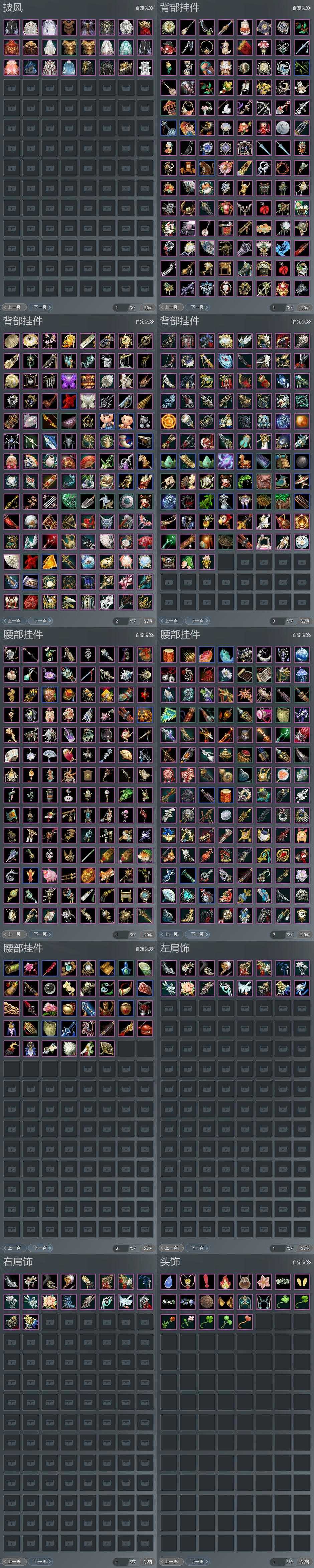 【肩饰】16左,18右,[双鱼曳波·无量·左, 风明雪华·左, 歃血关山·左, 日月无心·左, 云中雪霁·左, 浮屠明音·左, 碧翎叠云·左, 陌上窈窕·左, 北望天狼·左, 鹤影天青·左, 九阙天影·左][风明雪华·右, 歃血关山·右, 日月无心·右, 云中雪霁·右, 浮屠明音·右, 碧翎叠云·右, 陌上窈窕·右, 玄天覆雪·右, 北望天狼·右, 鹤影天青·右, 九阙天影·右]