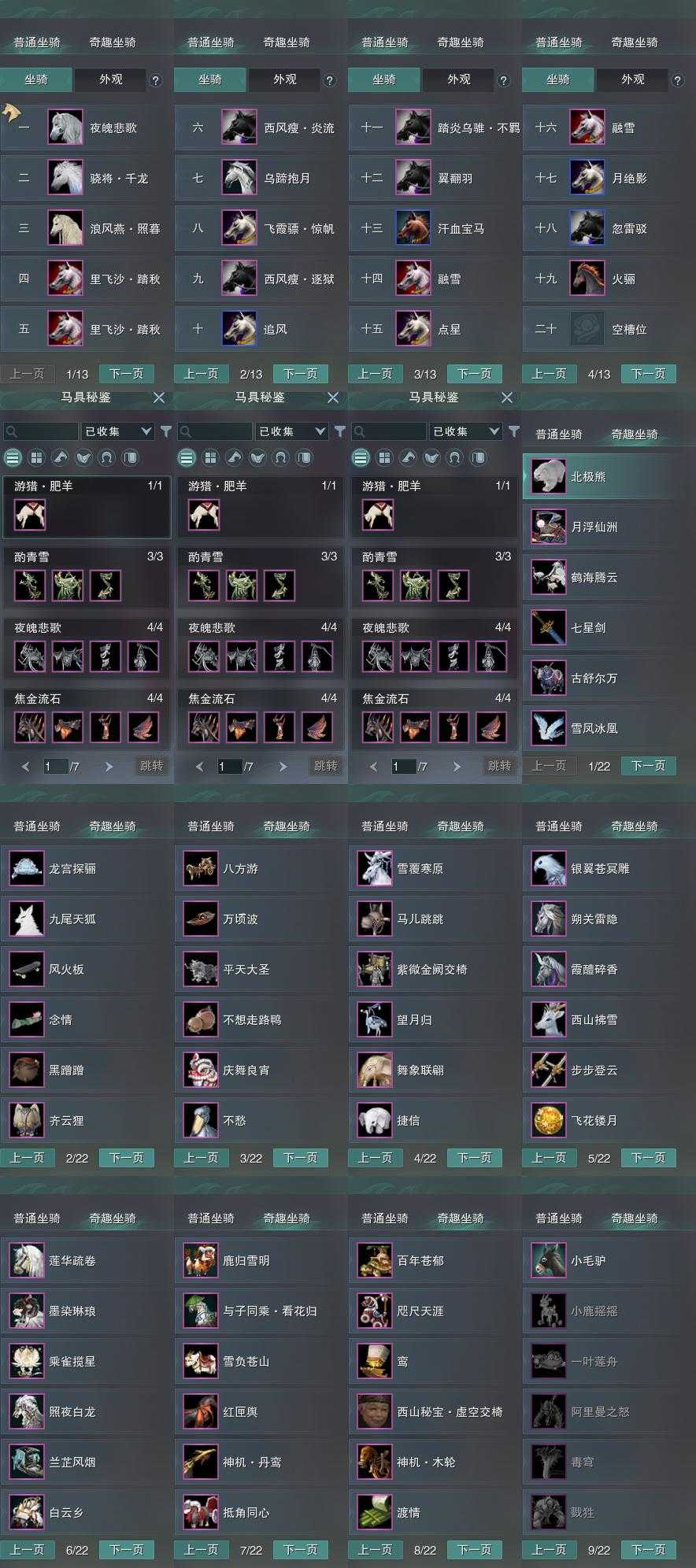 【坐骑】19个[踏炎不羁, 西风瘦炎流, 西风瘦逐狱, 飞霞骠惊帆, 乌蹄抱月, 里飞沙踏秋, 里飞沙踏秋, 黑翅马, 骁将千龙]