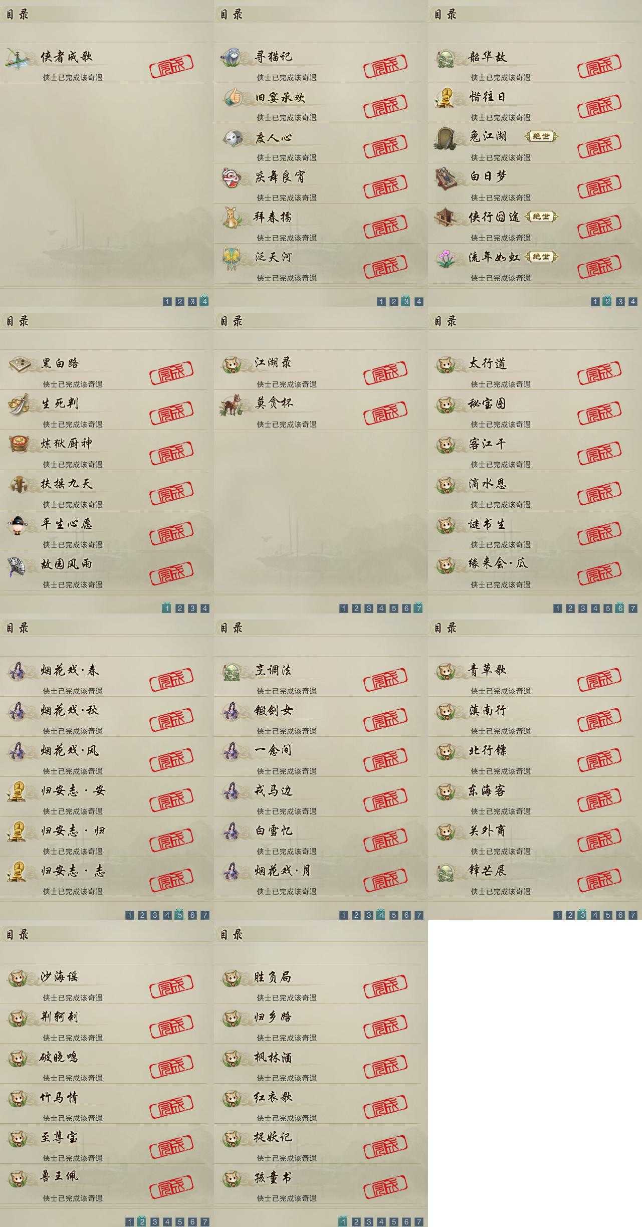 【奇遇】19个[白日梦, 兔江湖, 黑白路, 平生心愿, 惜往日, 韶华故, 扶摇九天, 故园风雨, 流年如虹, 寻猫记, 侠行囧途, 庆舞良宵, 生死判, 炼狱厨神, 度人心, 旧宴承欢, 泛天河, 侠者成歌, 拜春擂]