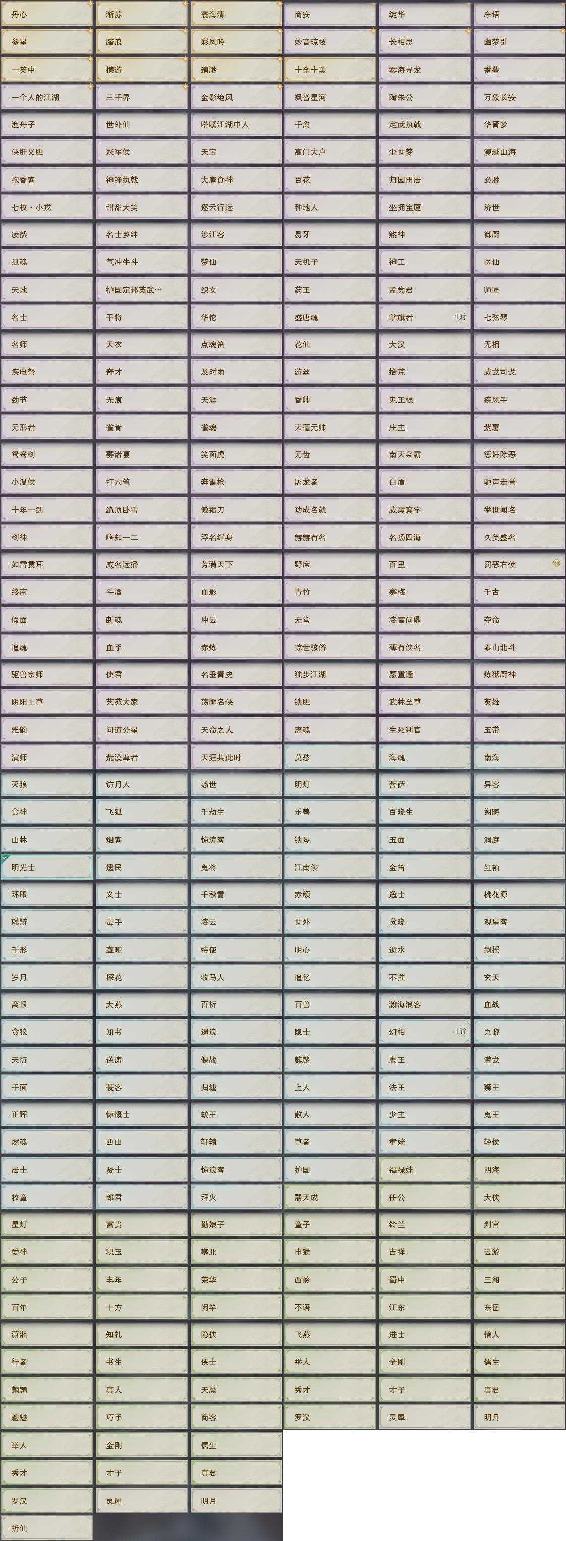 盒子:[黑盒, 雪月盒, 黑端午盒, 秃盒, 狄盒, 歌盒, 喵盒, 猪盒, 四代七夕盒, 粉盒, 五七盒, 青盒, 白盒, 苍盒, 二代元宵盒, 澡盒, 白楼兰盒, 竹笛盒, 扇盒, 卿酒盒, 紫持君令(标), 兰陵盒(缺白发), 绿千山(标), 黑战国(标), 蓝浮光(标)]