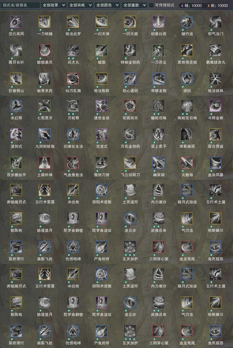 【橙武】(仅本门派)[120小铁*50, 130小铁*19, 110小铁*4, 100小铁*4, 95小铁*204, 90小铁*196, 80小铁*284, 70小铁*10, 100CW青雀无尘, 95CW青玉流, 门派特效风雷瑶琴剑]