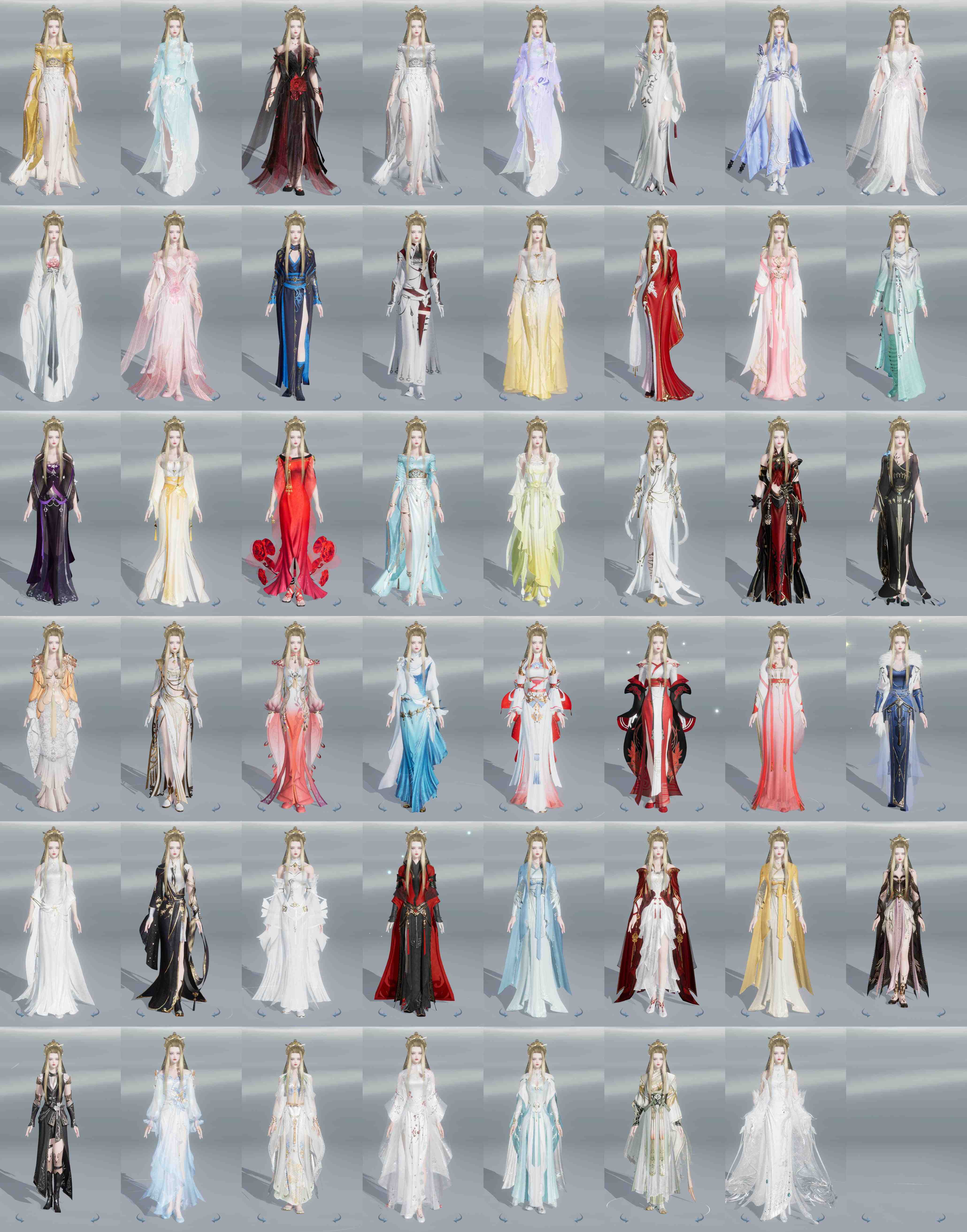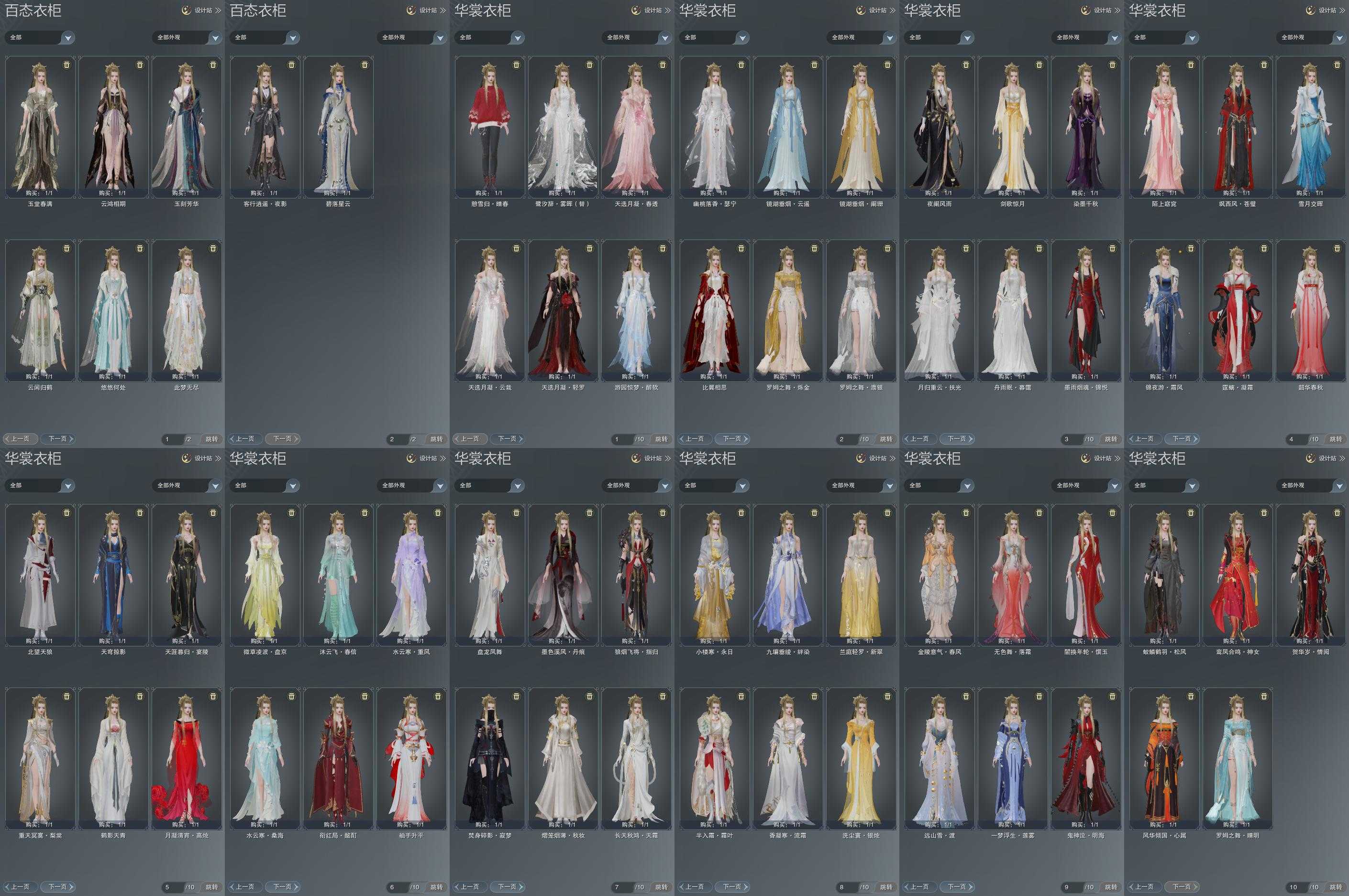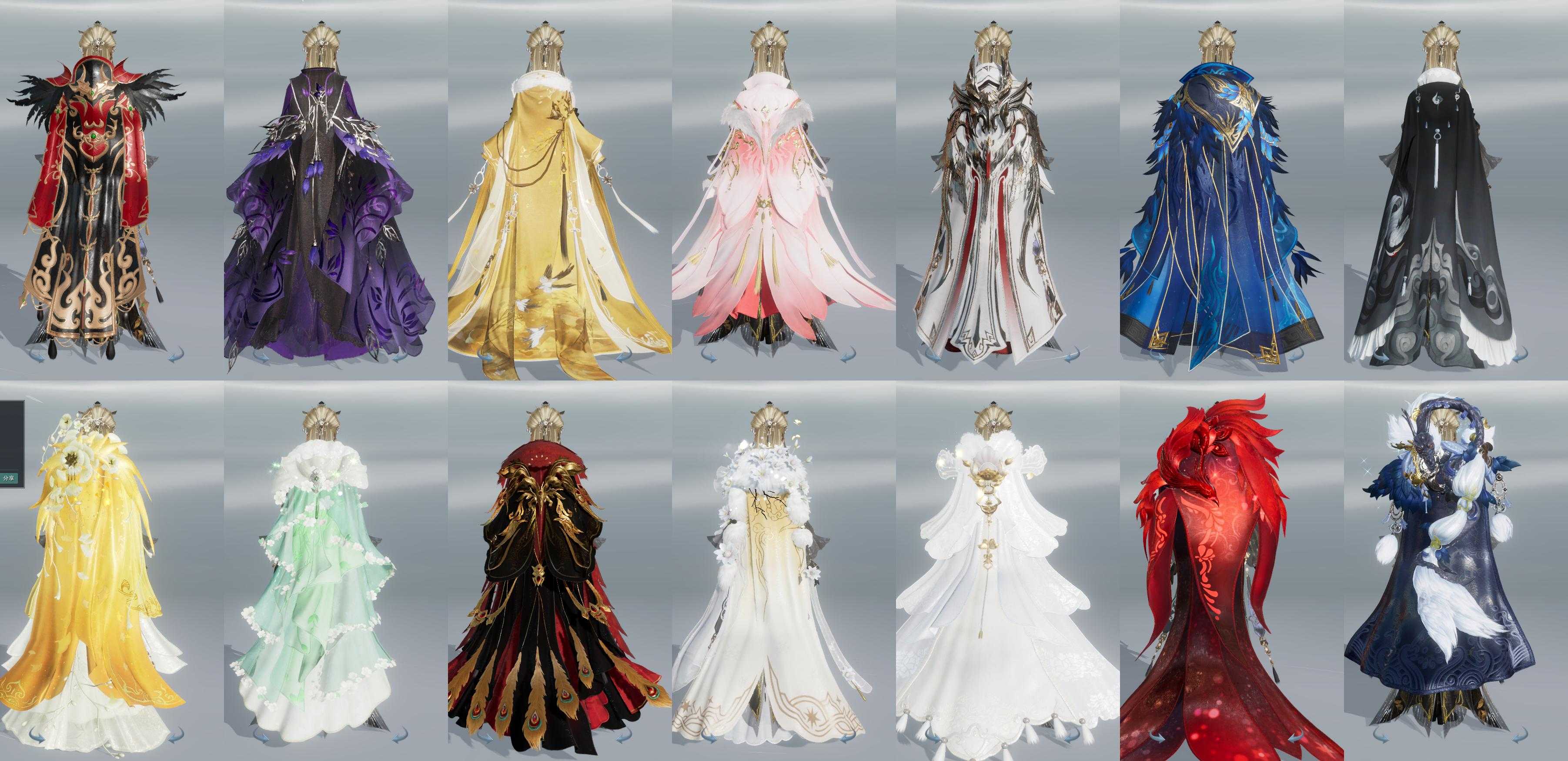 限时限量:[水云寒桑海, 黄九壤, 水云寒重风, 兰庭新翠, 绿云飞, 红玫瑰, 白长天, 微草盘京, 黑天涯, 重天梨棠, 霆螭凝霜, 锦夜游霜风, 黑红西风, 镜湖云遥, 镜湖阑珊, 十二周年工作服, 客行逍遥夜影, 十三周年成衣, 十四周年工作服, 云闲归鹤]