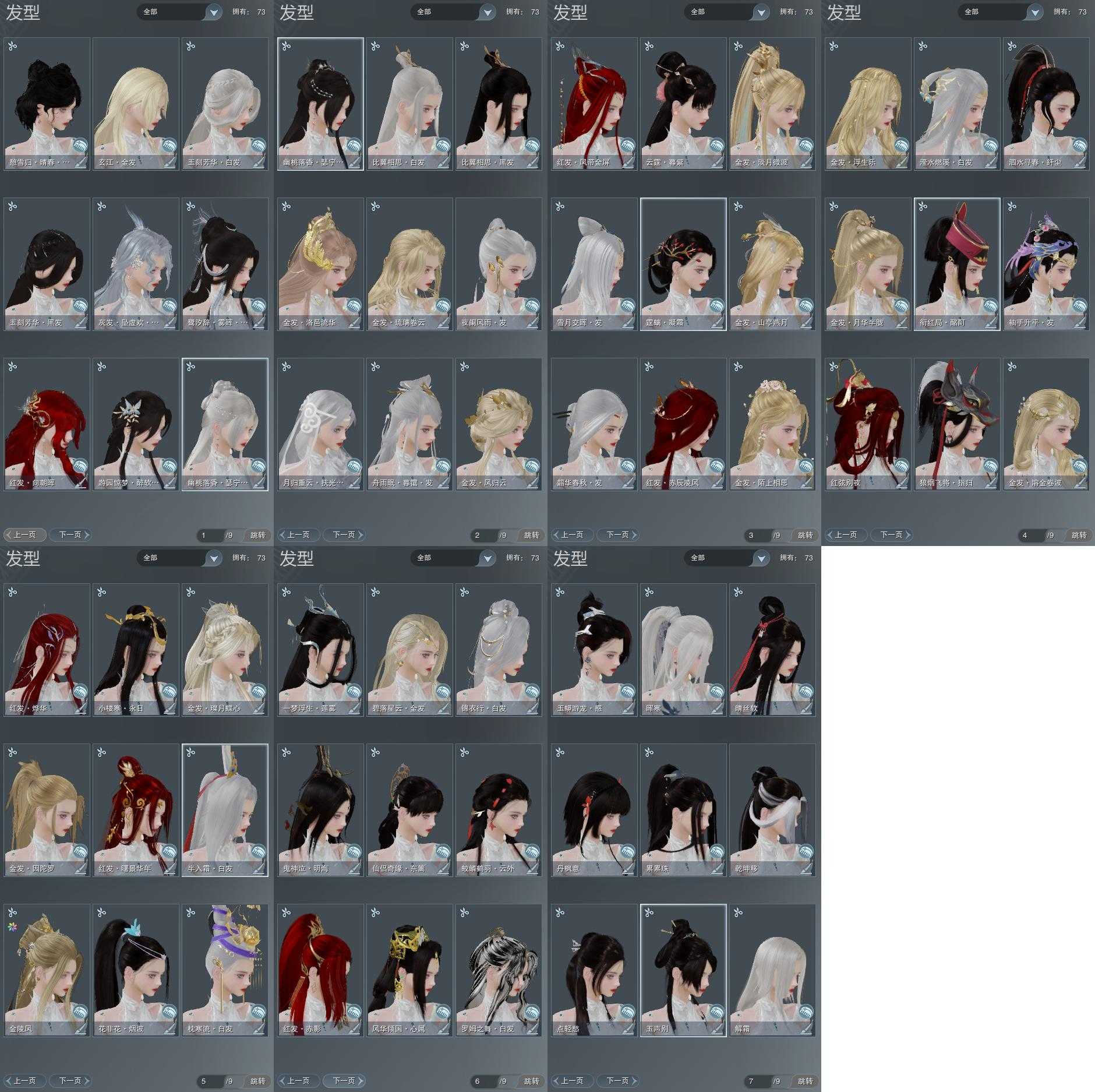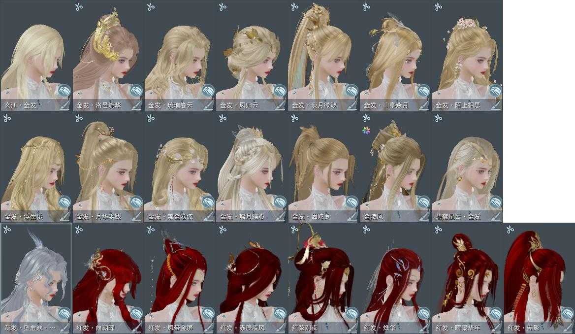 【发型】金发14个[一代金, 狐金, 猴金, 鸡金, 蝶金, 喵金, 考金, 国金, 苏金, 倒闭金, 狗金, 龙女金, 玫瑰金, 玄江金发], 红发8个[五红, 七红, 八红, 十四红, 猴红, 鸡红, 狗红, 三代灰银], 黑发26个, 白发15个, 盒子发型[元宵黑, 二代七夕白, 一代花朝白白, 狗白, 黑端午白发, 雪月白发, 五代七夕黑发, 五代七夕白发, 蓝游园黑发, 原色幽香黑发, 原色幽香白发, 白鹭黑发, 红毛衣黑发], 总页数8