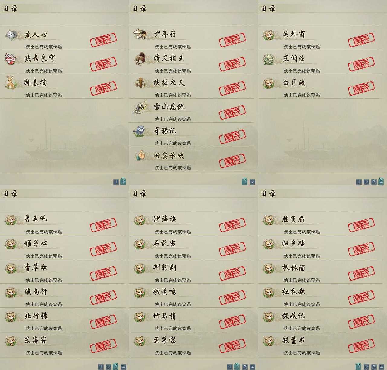 【奇遇】9个[雪山恩仇, 少年行, 扶摇九天, 清风捕王, 寻猫记, 庆舞良宵, 度人心, 旧宴承欢, 拜春擂]
