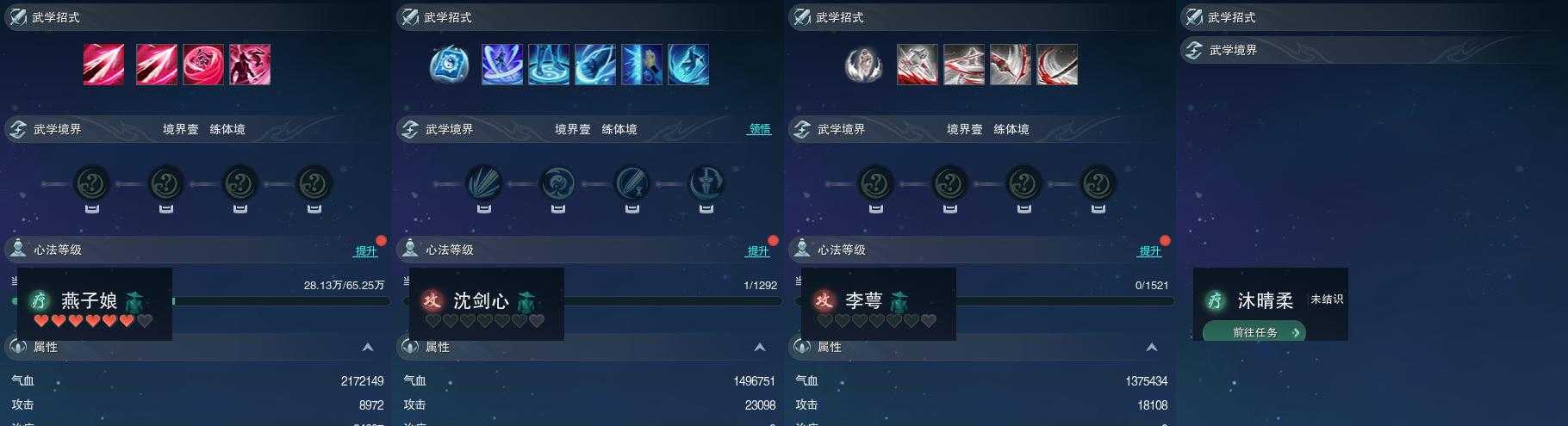 【同伴】燕子娘81级境界壹,沈剑心1级境界壹,李萼志1级境界壹,沐晴柔级