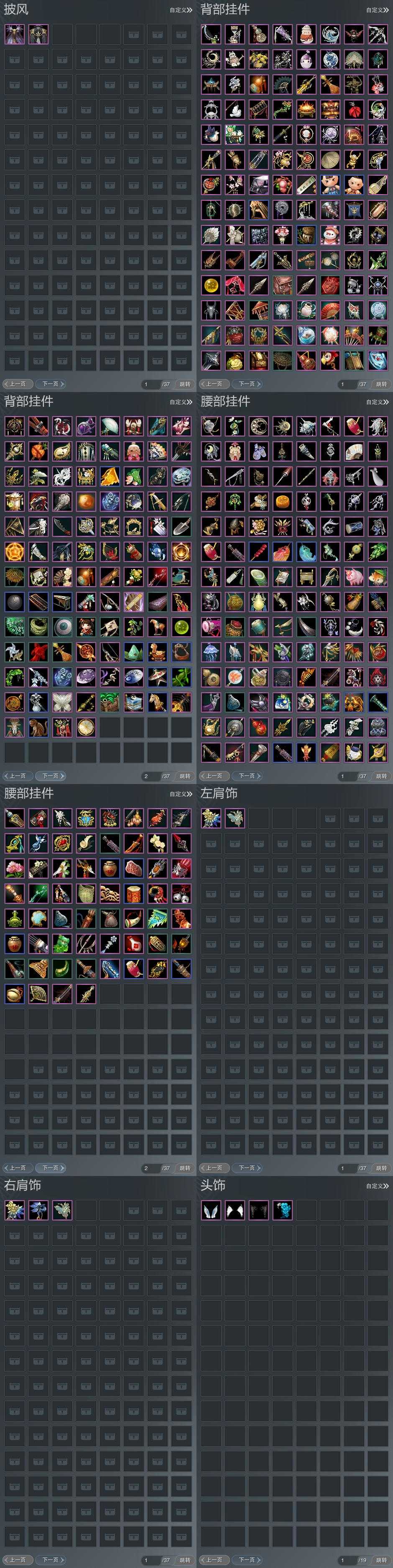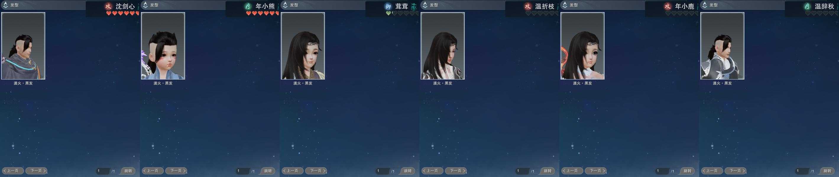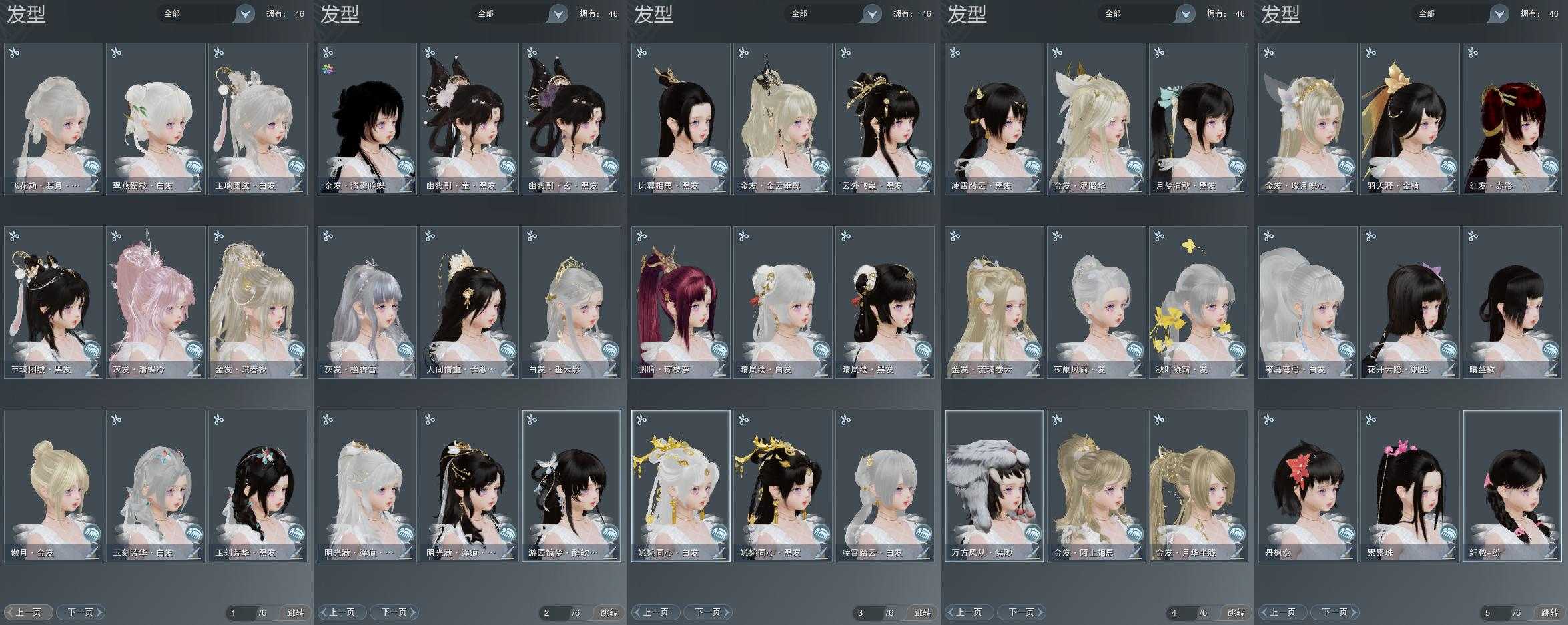 【发型】金发9个[狐金, 中秋金, 鸡金, 考金, 龙女金, 苍金, 水母金, 傲月金发, 蛇金], 红发4个[五红, 紫发, 蝶粉, 一代灰], 黑发20个, 白发12个, 盒子发型[一代重阳白, 踏云黑发, 四代七夕黑发, 黑端午白发, 晴岚绘黑发, 踏云白发, 四代七夕白发, 飞皇黑发, 五代七夕黑发, 晴岚绘白发, 新蓝游园黑, 白明光黑发, 白明光白发, 绿人间黑发, 白幽馥黑发, 黑幽馥黑发, 玉璃盒黑发, 玉璃盒白发], 总页数6