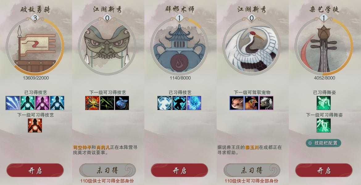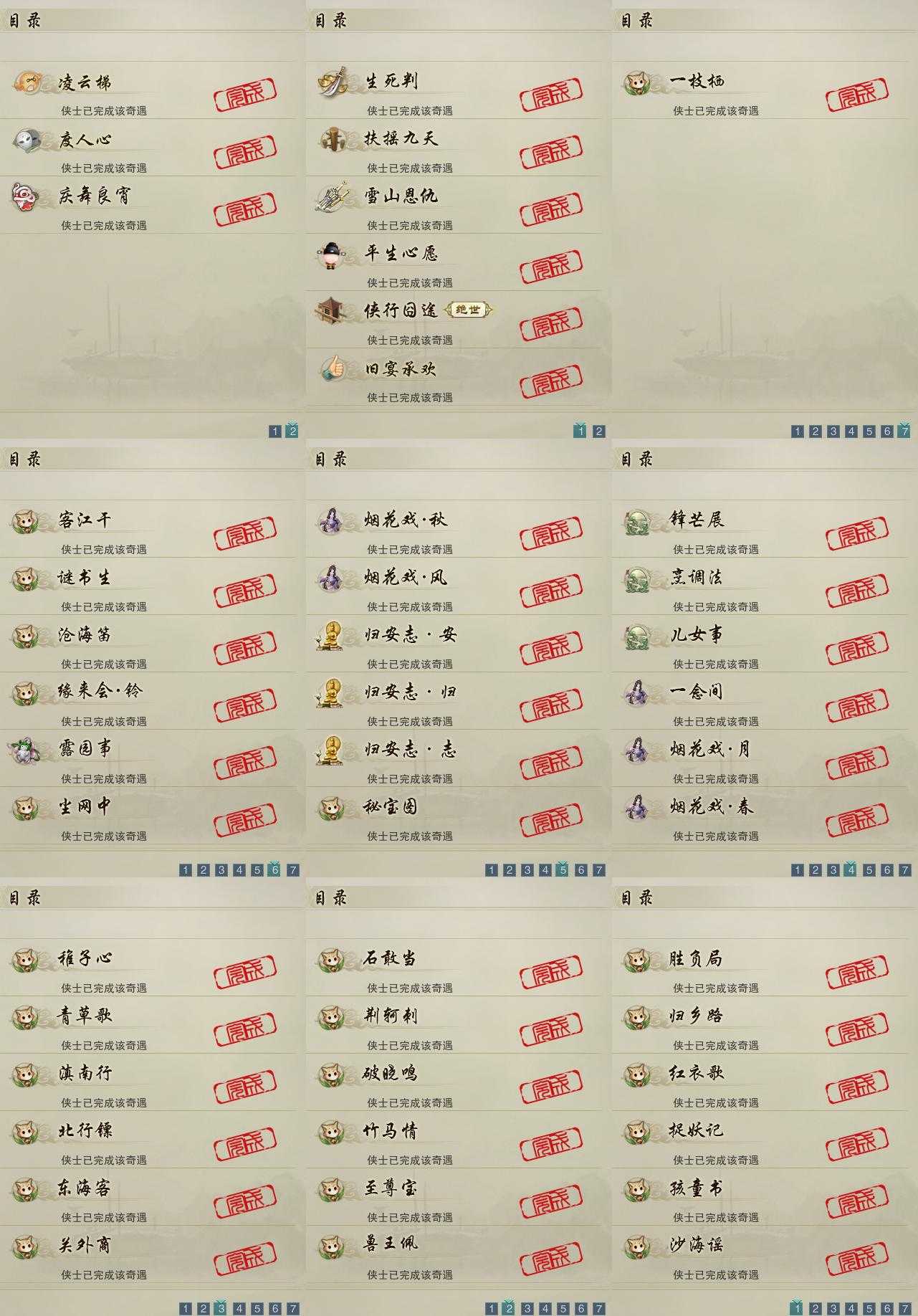 【奇遇】9个[雪山恩仇, 平生心愿, 扶摇九天, 侠行囧途, 庆舞良宵, 生死判, 凌云梯, 度人心, 旧宴承欢]
