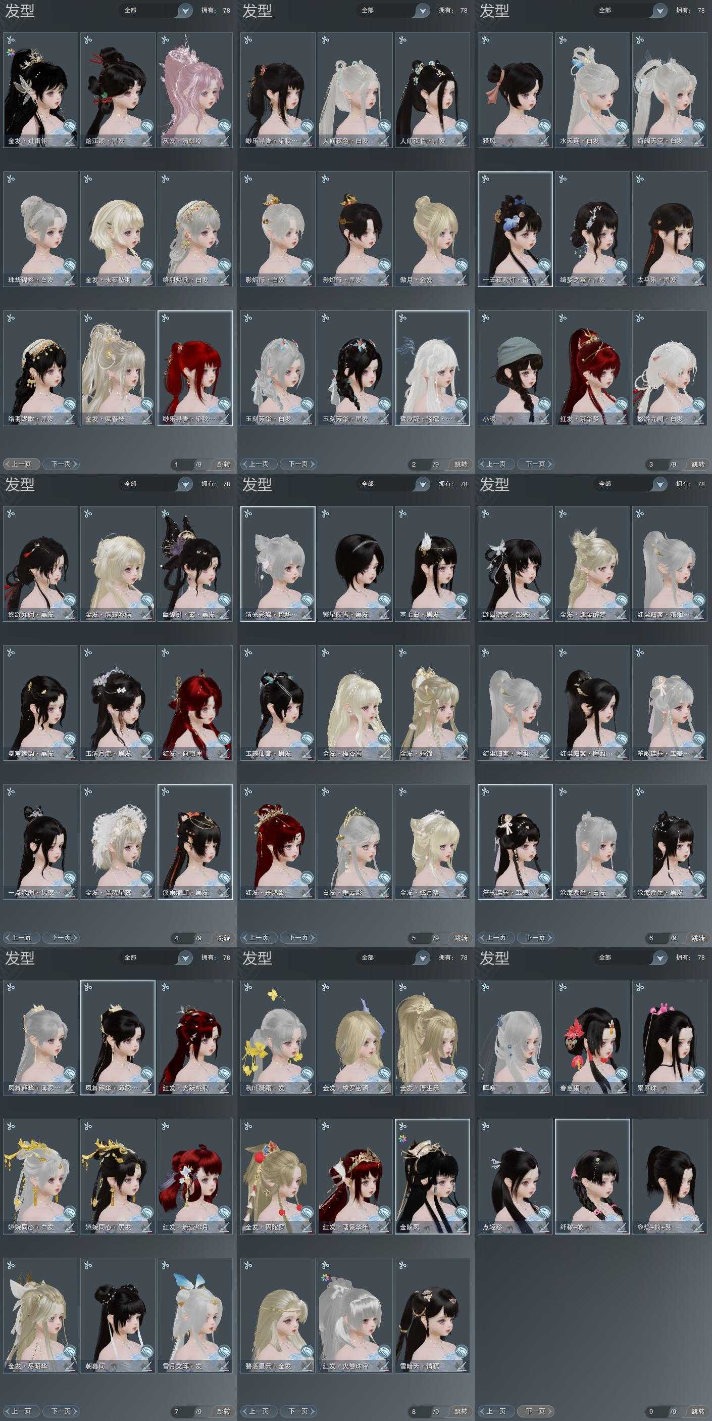【发型】金发16个[一代金, 猴金, 资历金, 中秋金, 喵金, 苏金, 牛金, 巴卡金, 虎金, 一代灰金, 蔷薇金, 水母金, 傲月金发, 蛇金, 永夜金, 翎金], 红发9个[六红, 十一红, 十四红, 蝶粉, 猴红, 虎红, 小资历红, 龙红, 红寻香红发], 黑发34个, 白发20个, 盒子发型[一代重阳白, 四代七夕黑发, 雪月白发, 四代七夕白发, 薄雾黑发, 沧海黑发, 唐风玉壶黑发, 黑红尘黑发, 白红尘黑发, 薄雾白发, 白游园黑发, 沧海白发, 唐风玉壶白发, 黑红尘白发, 白红尘白发, 山海黑发, 不良人盒黑发, 蓝钻石盒白发, 虹猫盒黑发, 黑沧洲盒黑发, 八七盒黑发, 黑幽馥黑发, 游龙盒黑发, 婚纱盒黑发, 蓝观灯盒黑发, 游龙盒白发, 海阔盒白发, 蓝鹭白发, 镰刀黑发, 人间夜色黑发, 镰刀白发, 人间夜色白发, 红寻香黑发, 络羽黑发, 络羽白发], 总页数9