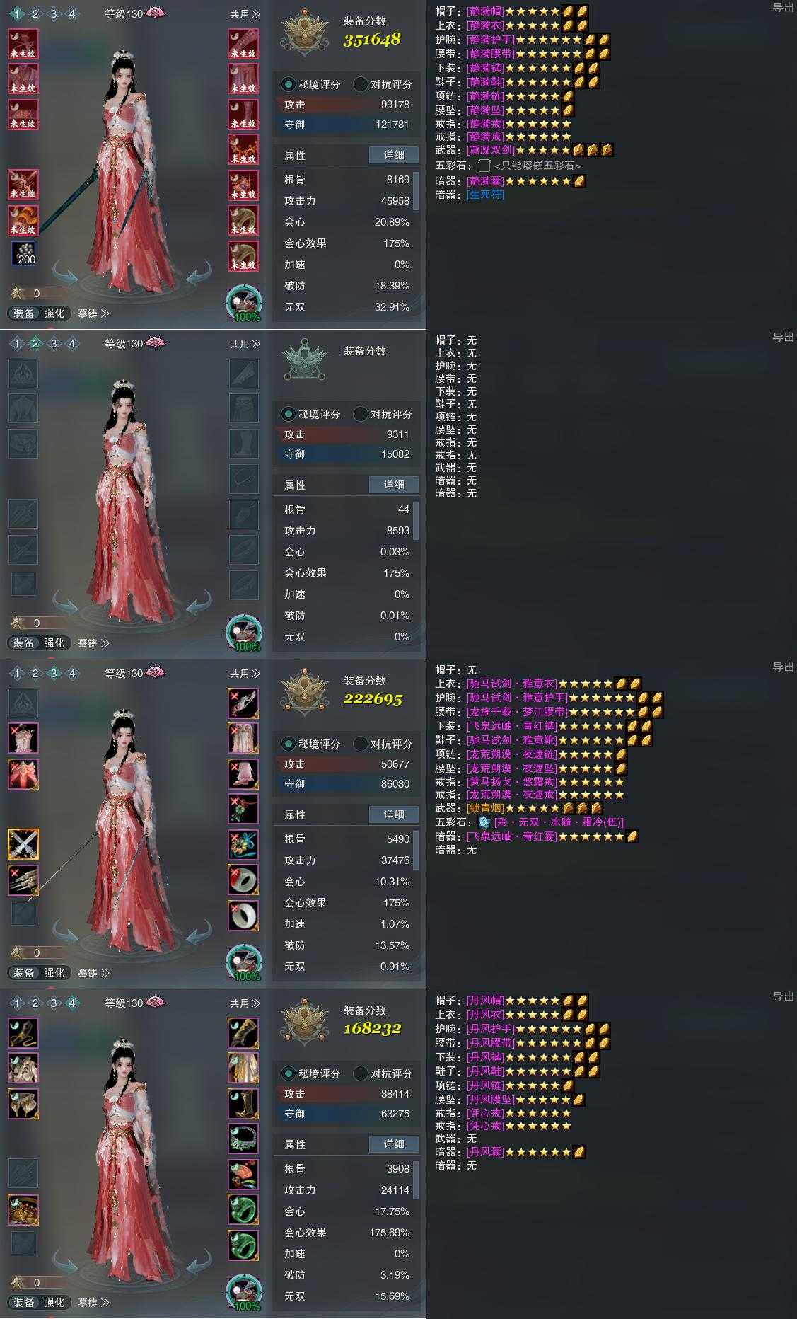【装备】130级,装备一351648,装备二0,装备三222695,装备四168232