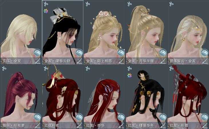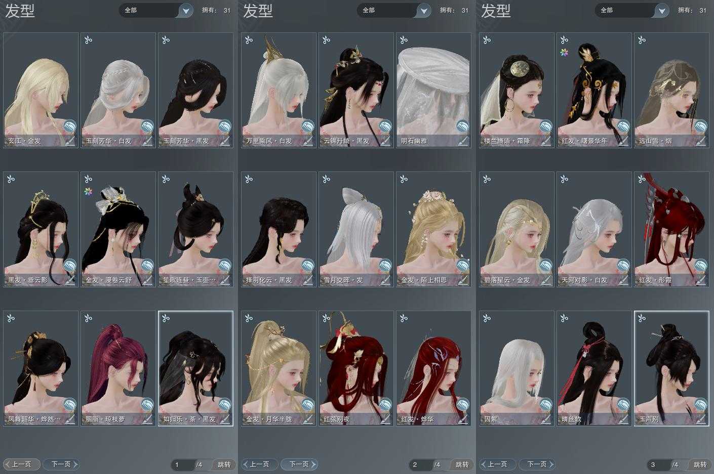 【发型】金发5个[鸡金, 考金, 苏金, 云金, 玄江金发], 红发5个[七红, 紫发, 羊红, 猴红, 鸡红], 黑发11个, 白发5个, 盒子发型[雪月白发, 乘风白发, 烨然黑发, 唐风玉壶黑发], 总页数4