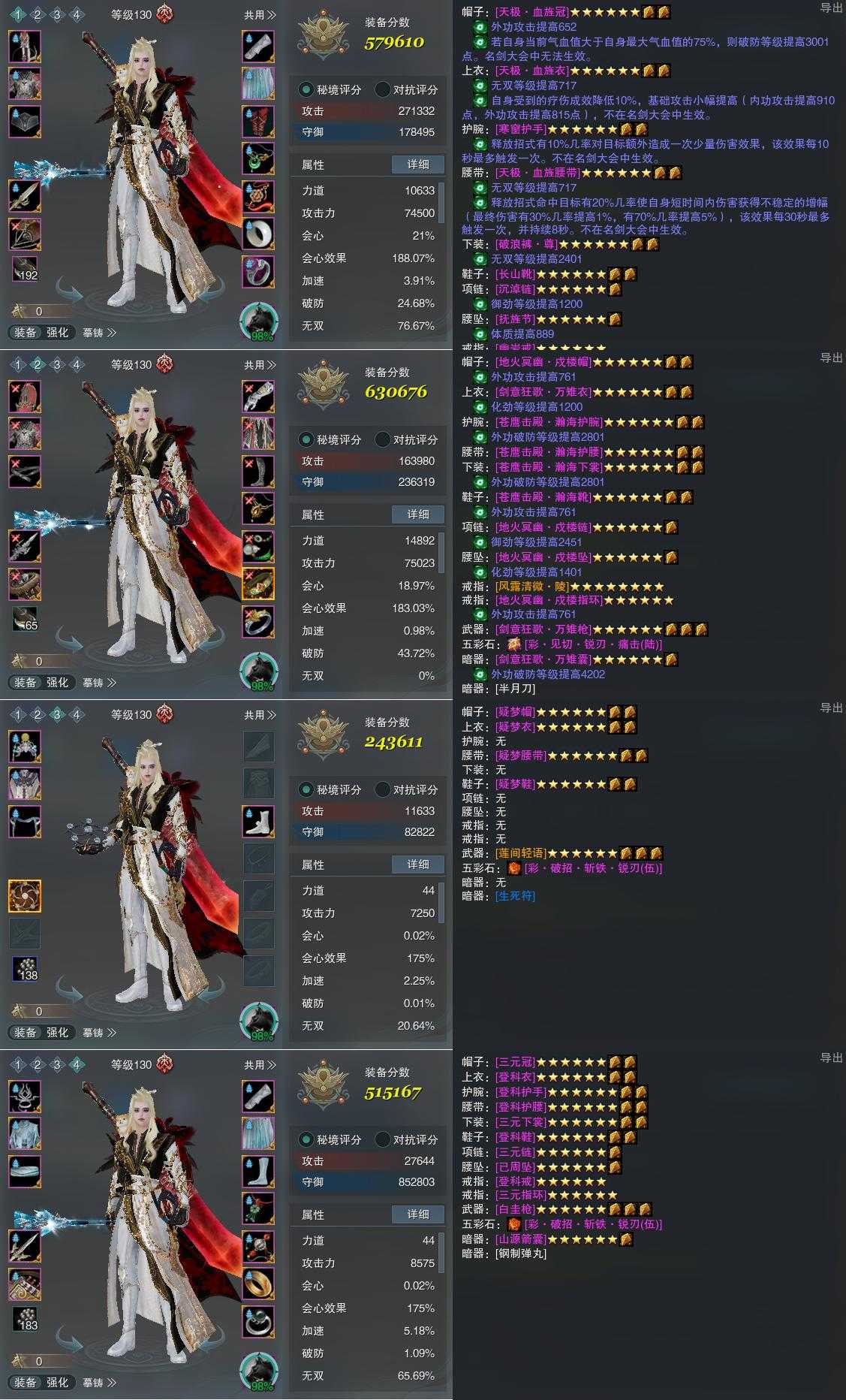 【装备】130级,傲血战意PVE579610,傲血战意PVP630676,装备三243611,铁牢律PVE515167