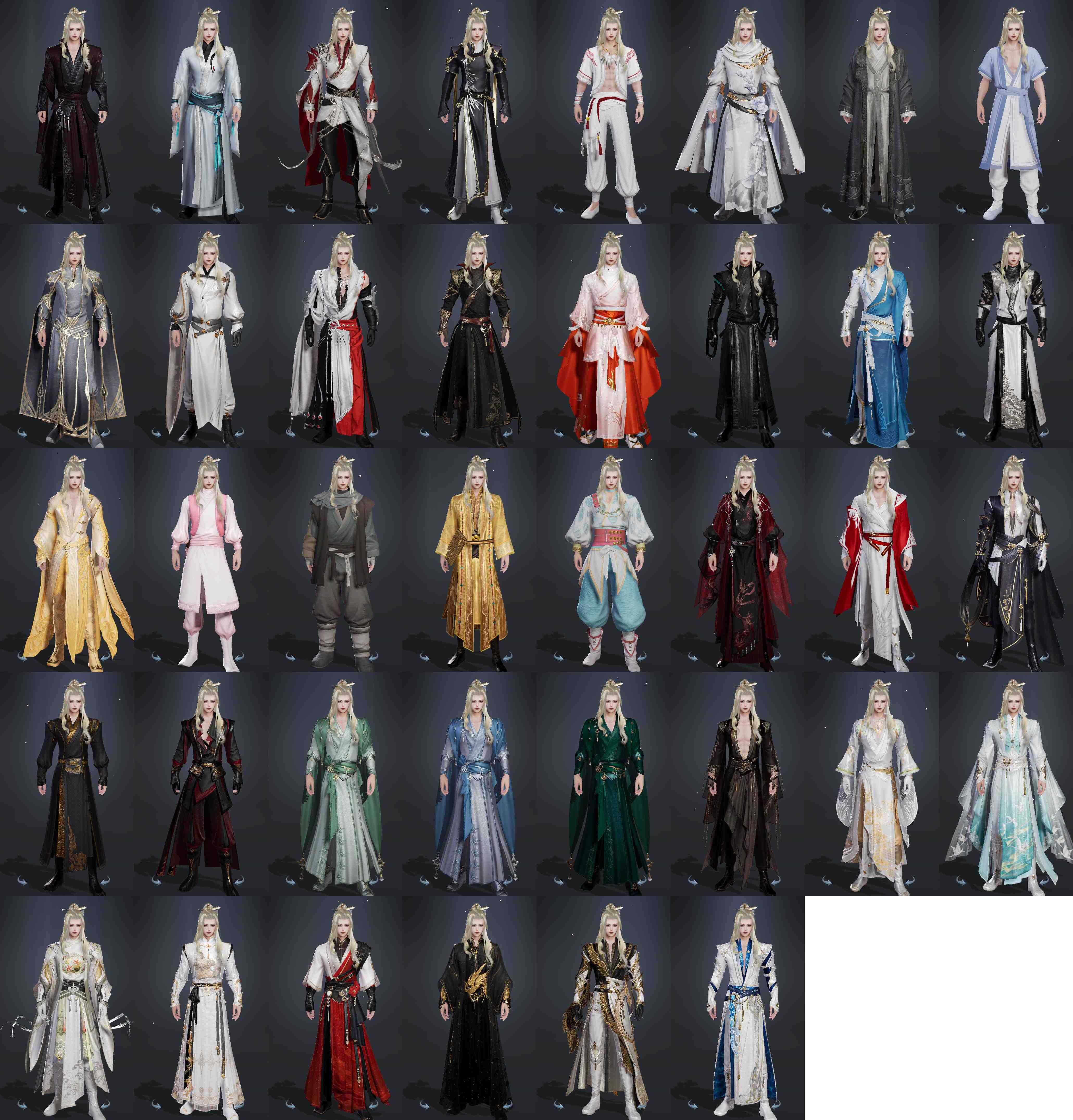 限时限量:[兰庭冷绣, 海韵小调, 道袍, 黄玫瑰, 微草暮雨, 红舞步, 十三万资历衣, 瀚漠民服, 兰若渝州, 烟花套, 镜湖吹荷, 镜湖云遥, 镜湖踏晓, 十二周年工作服, 十三周年成衣, 十四周年工作服, 云闲归鹤, 白绮阁]