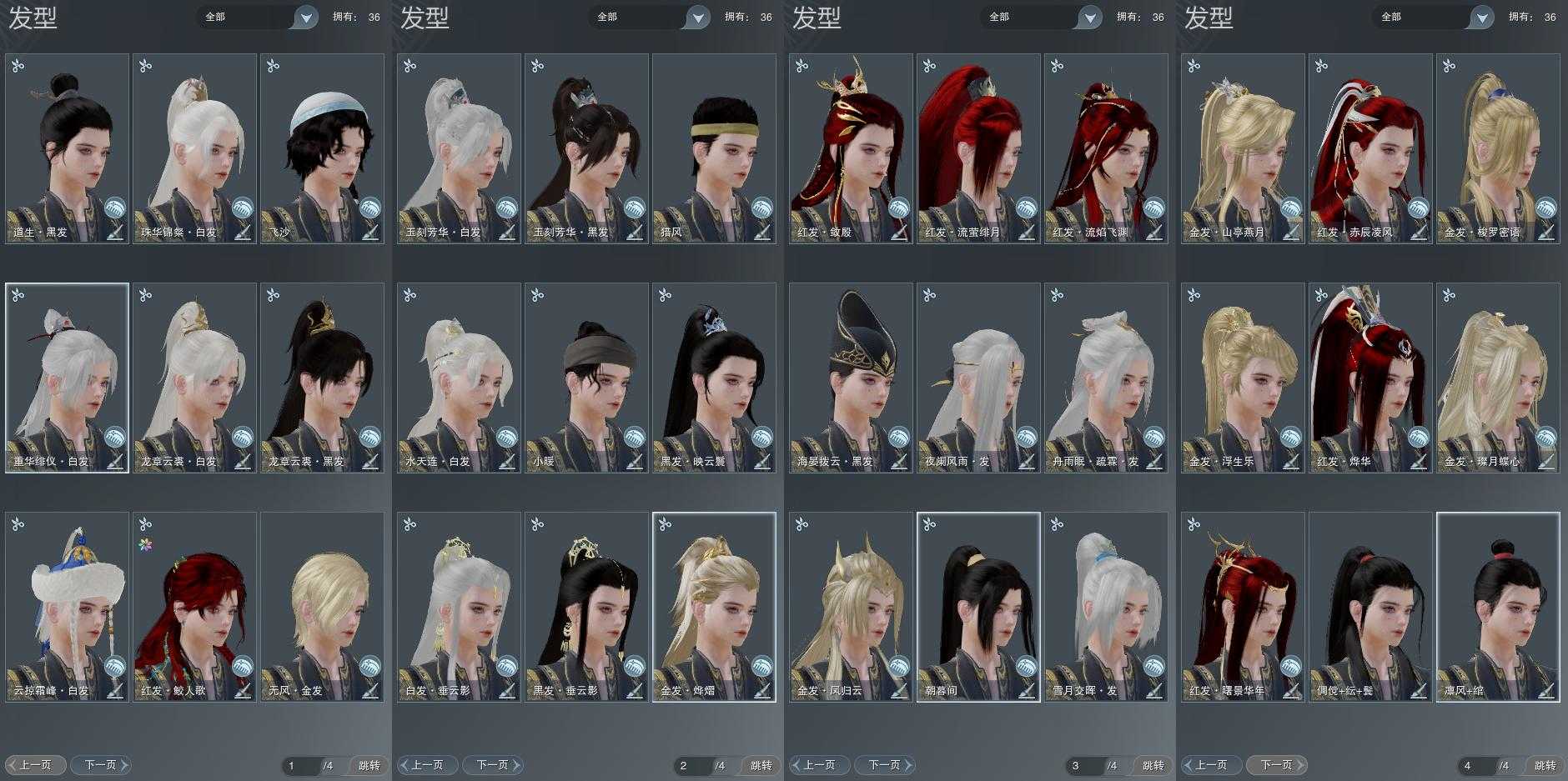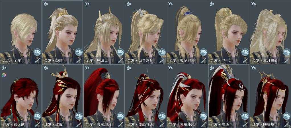 【发型】金发7个[狐金, 资历金, 喵金, 国金, 狗金, 猪金, 无风金发], 红发7个[七红, 八红, 九红, 猴红, 猪红, 小资历红, 十五红], 黑发10个, 白发10个, 盒子发型[狄仁杰黑, 一代花朝粉白, 黑端午白发, 雪月白发, 墨龙盒黑发, 云掠霜峰白发, 墨龙盒白发], 总页数4