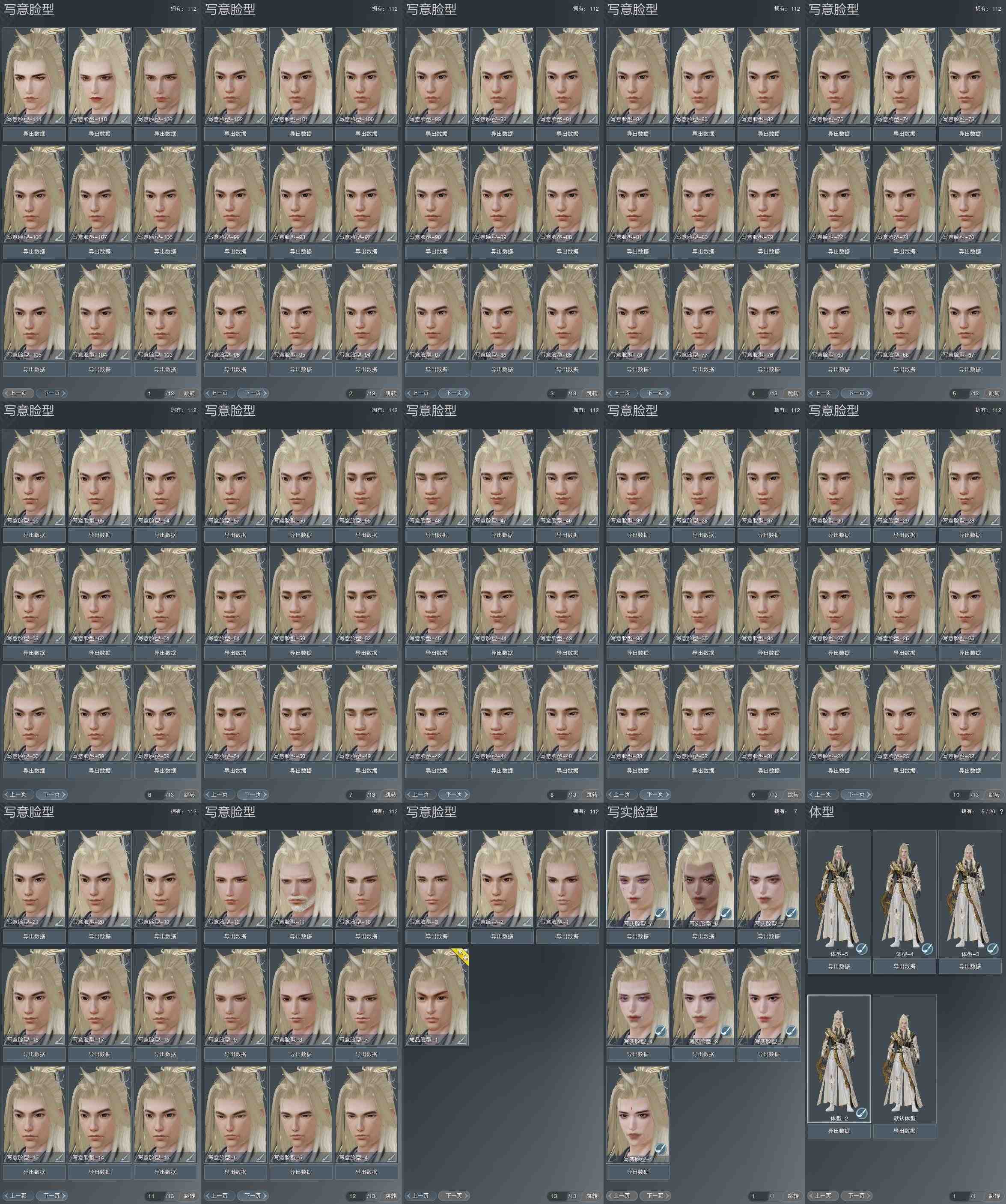 【捏脸】写意脸型112个,写实脸型7个,体型5个