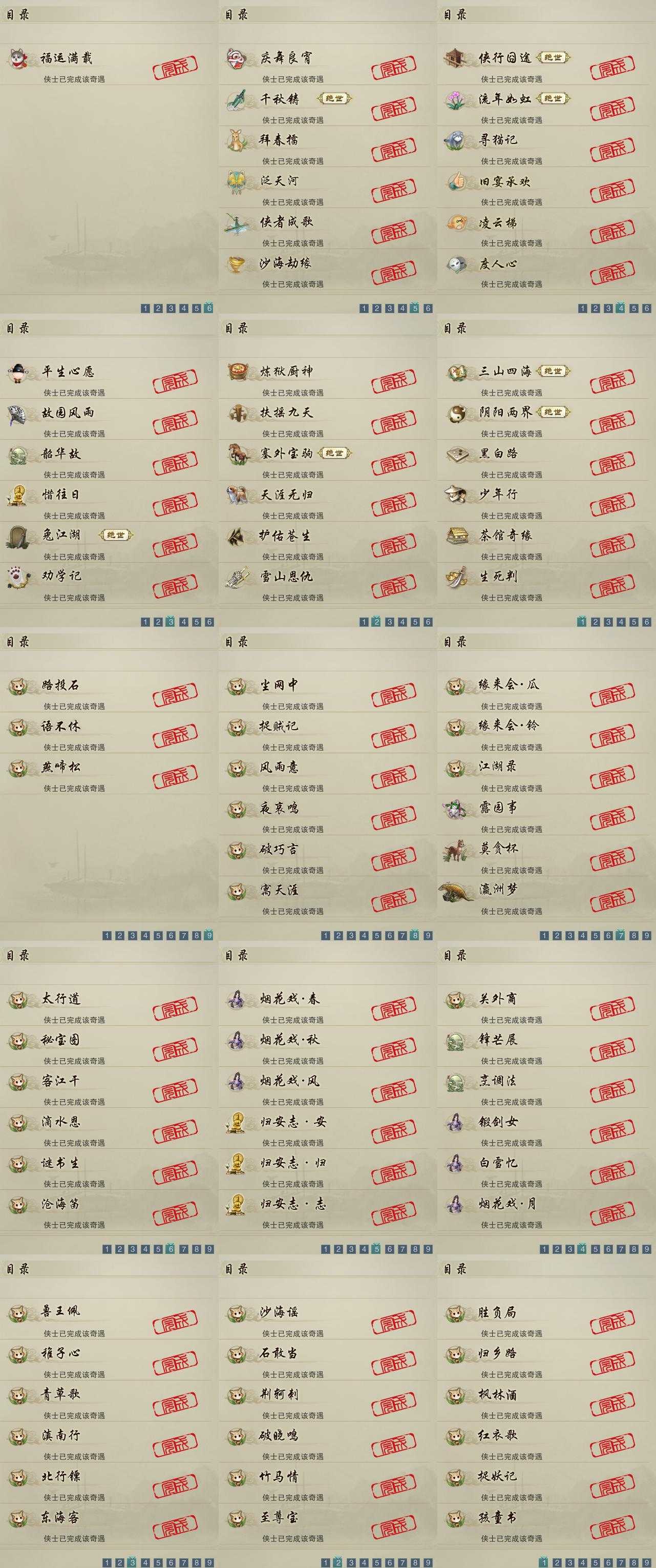 【奇遇】31个[天涯无归, 三山四海, 劝学记, 雪山恩仇, 阴阳两界, 平生心愿, 兔江湖, 黑白路, 惜往日, 塞外宝驹, 韶华故, 护佑苍生, 少年行, 故园风雨, 扶摇九天, 流年如虹, 侠行囧途, 寻猫记, 茶馆奇缘, 庆舞良宵, 生死判, 千秋铸, 凌云梯, 炼狱厨神, 度人心, 旧宴承欢, 泛天河, 侠者成歌, 拜春擂, 沙海劫缘]