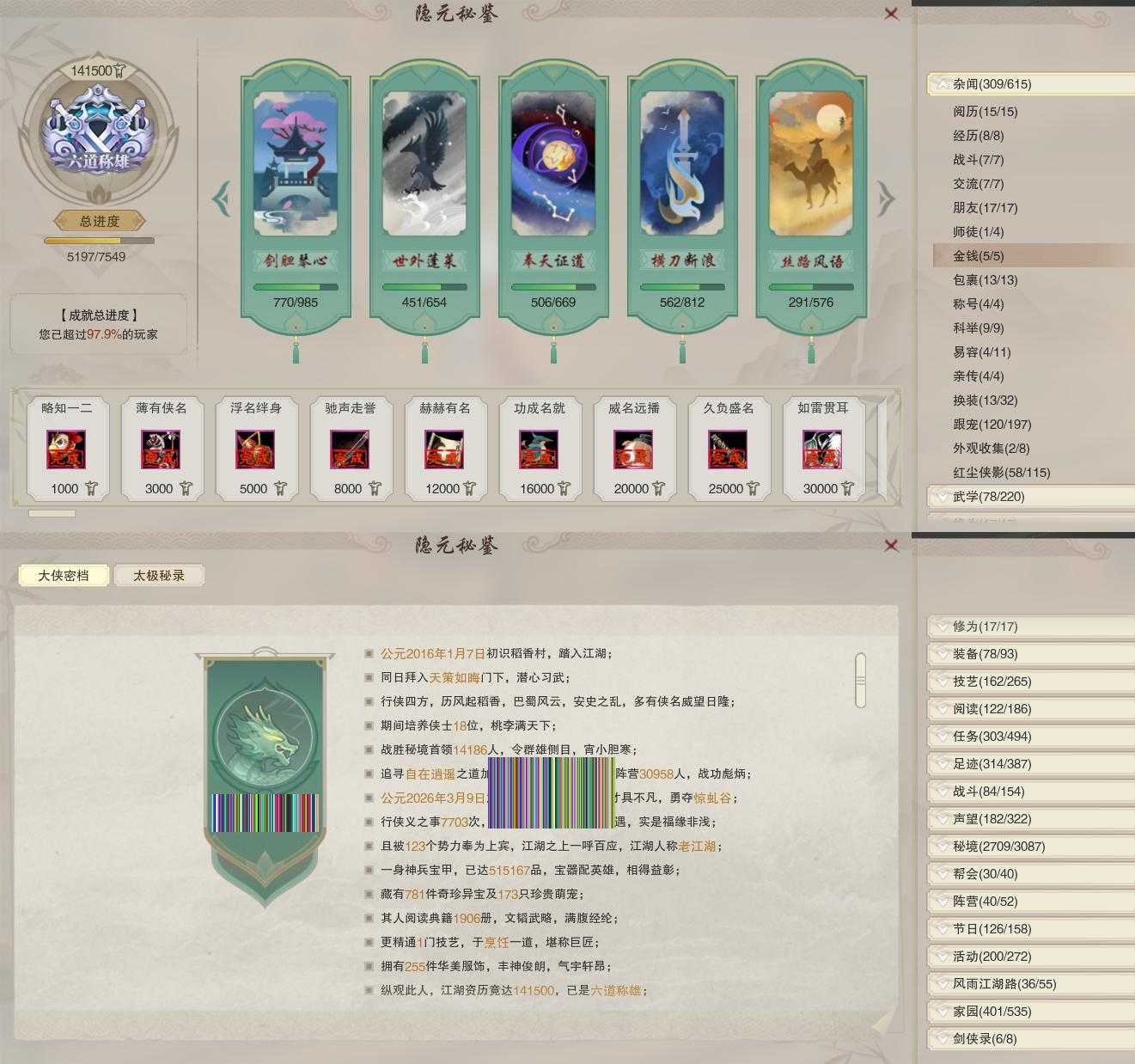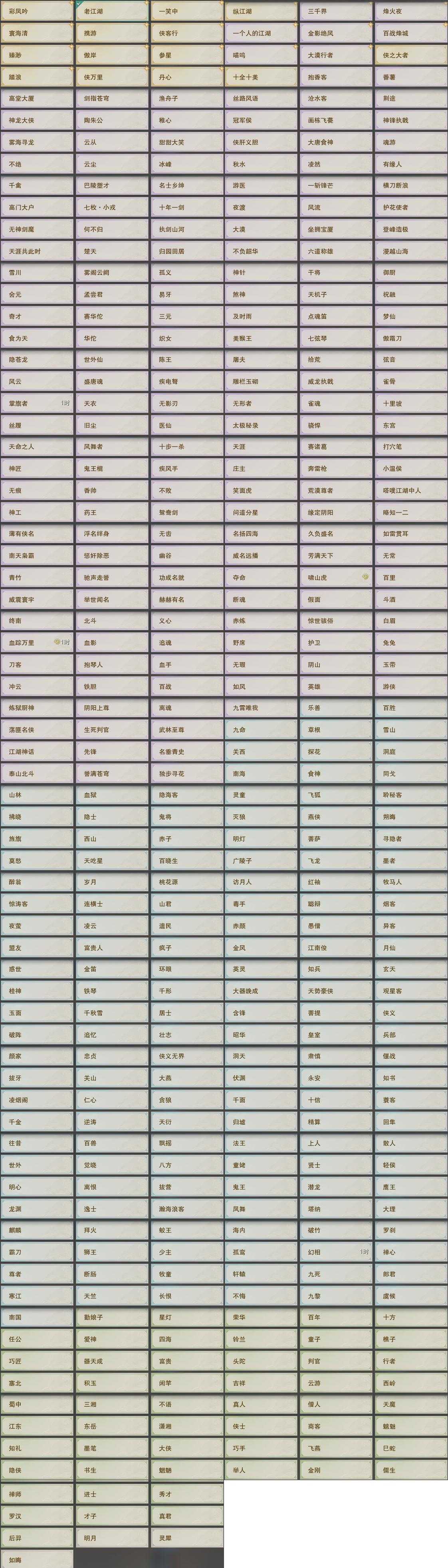 【称号】[纵江湖, 侠万里, 百战烽城]