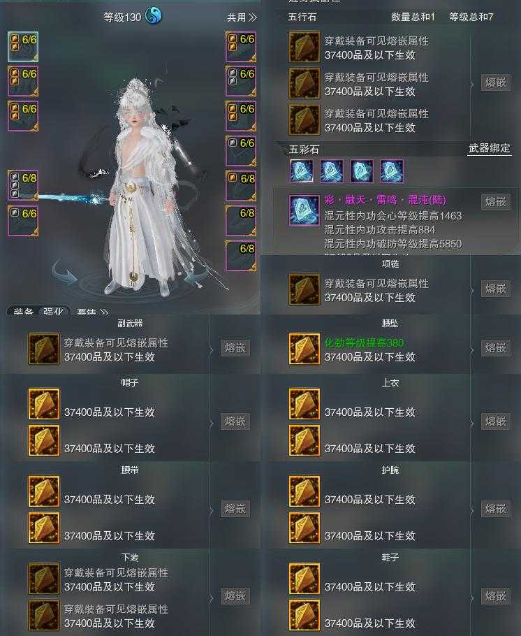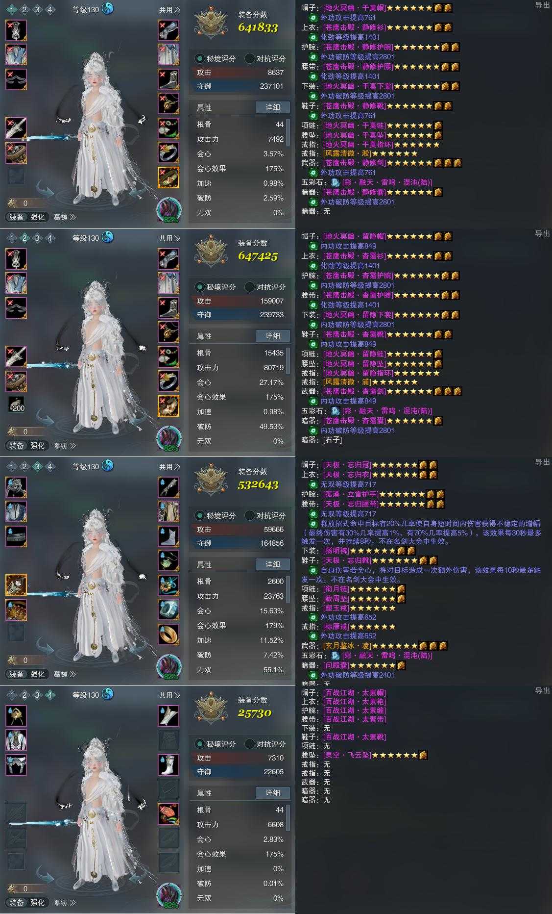 【装备】130级,太虚剑意PVP641833,紫霞功PVP647425,太虚剑意PVE532643,装备四25730