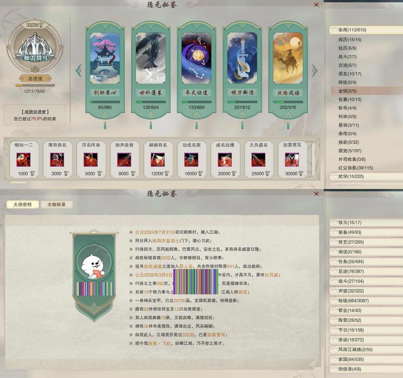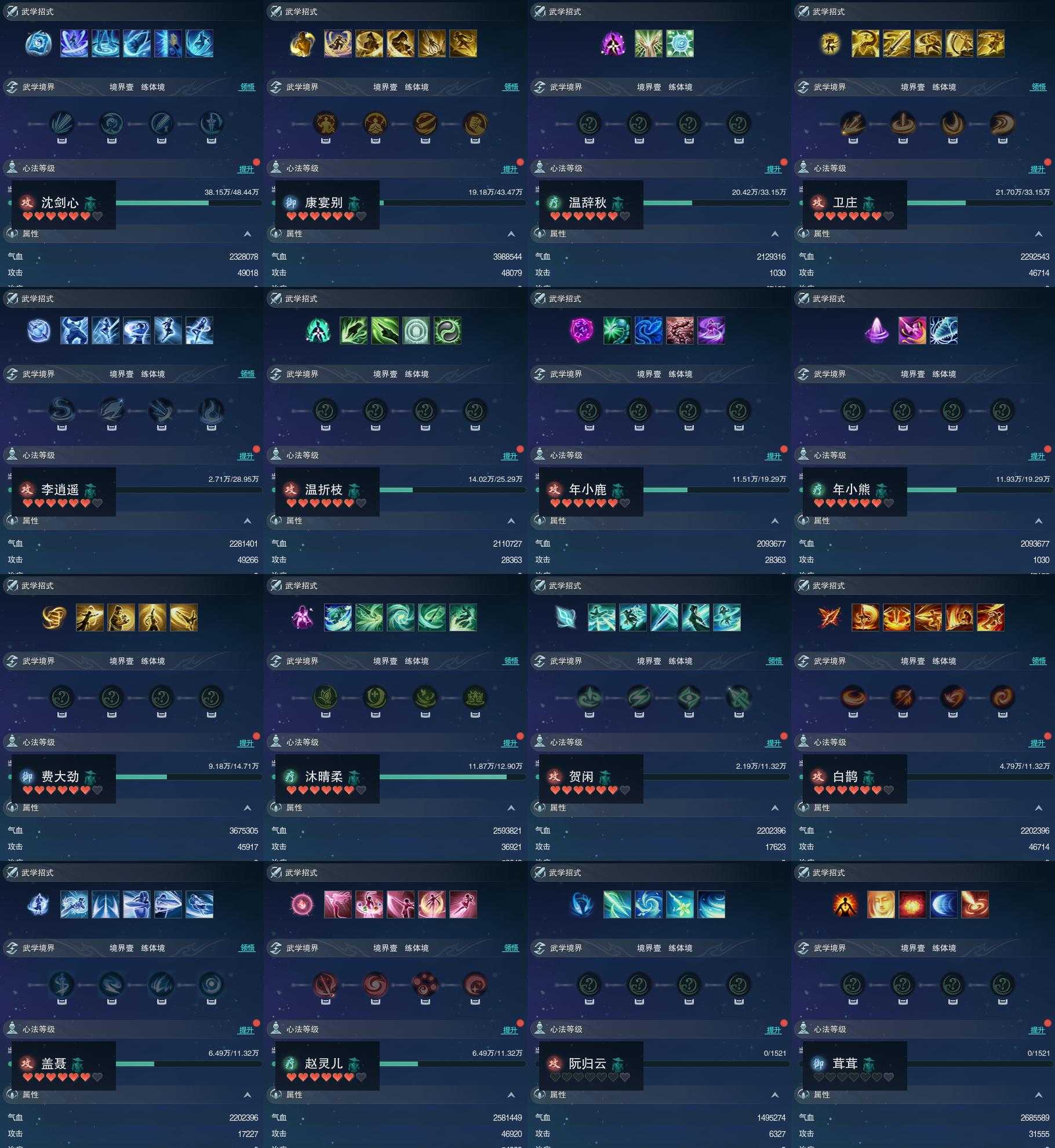 【同伴】沈剑心80级境界壹,康宴别78级境界壹,温辞秋76级境界壹,卫庄志76级境界壹,李逍遥75级境界壹,温折枝74级境界壹,年小鹿72级境界壹,年小熊72级境界壹,费大劲70级境界壹,沐晴柔69级境界壹,贺闲志68级境界壹,白鹊志68级境界壹,盖聂志68级境界壹,赵灵儿68级境界壹,阮归云1级境界壹,茸茸志1级境界壹