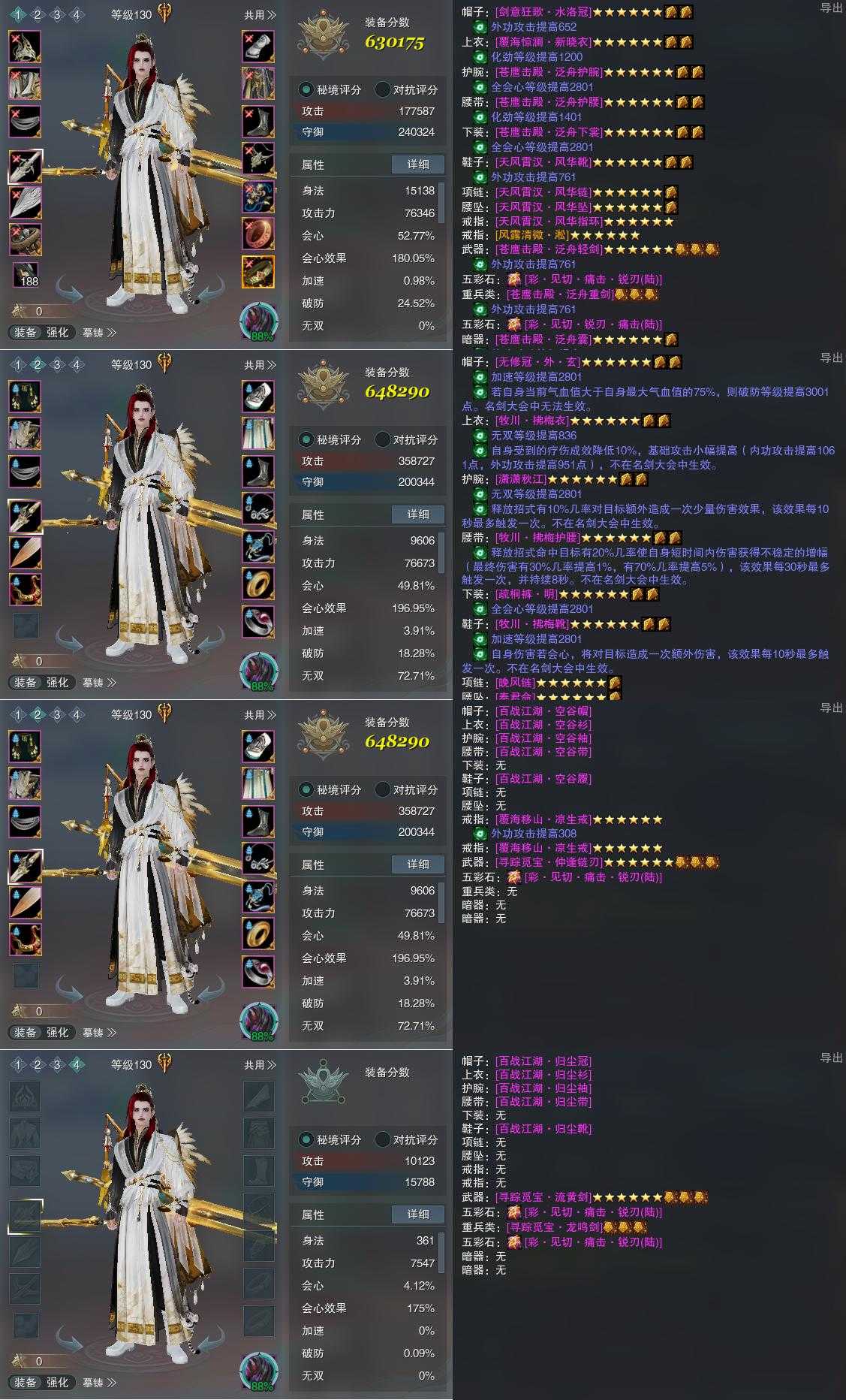 【装备】130级,山居剑意/问水诀PVP630175,山居剑意/问水诀PVE648290,藏剑装备三648290,装备四0