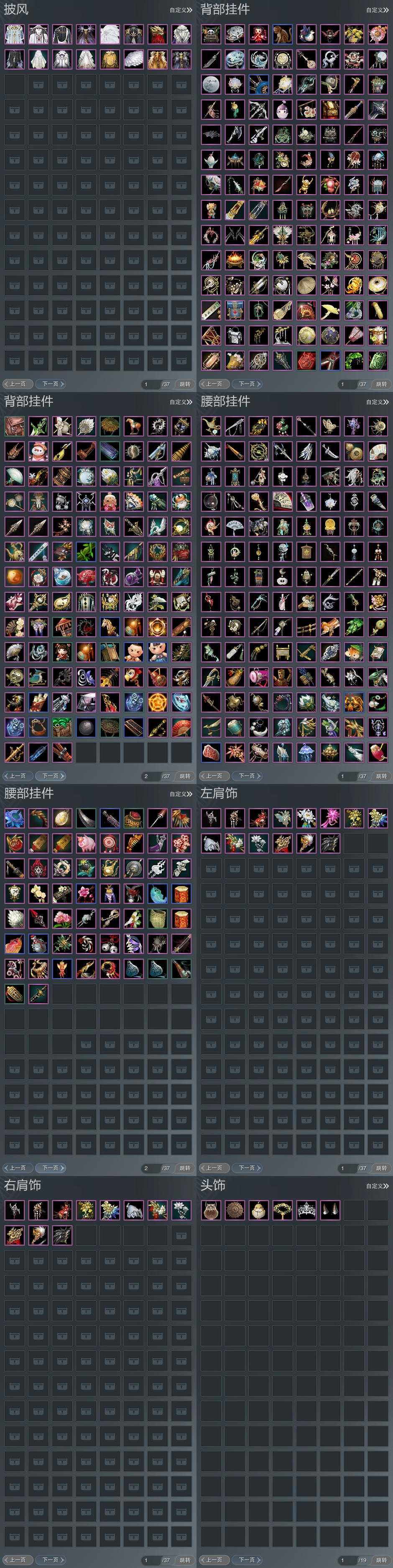 【背挂】219个[阴阳剑, 蓝黑白路, 毽子, 月梦清秋·扇, 凤鸣梧枝, 红纶苍鬓, 晚枝禅云·漱月, 识妆, 春山绘樱扇, 白楼兰伞, 黑楼兰伞, 雨怜菇, 五七盒挂件, 小金龙挂件, 八七盒挂件, 莲台盒背挂]