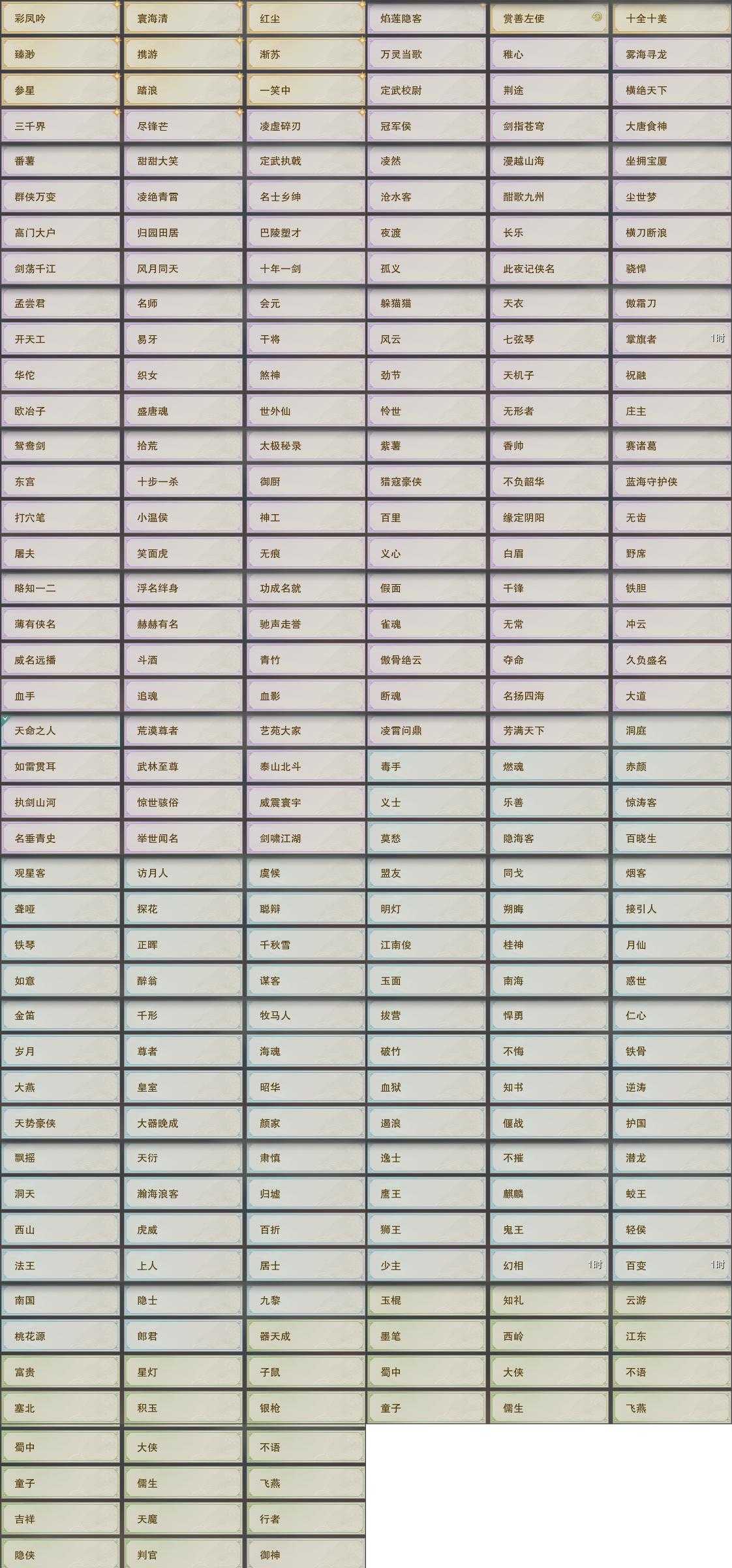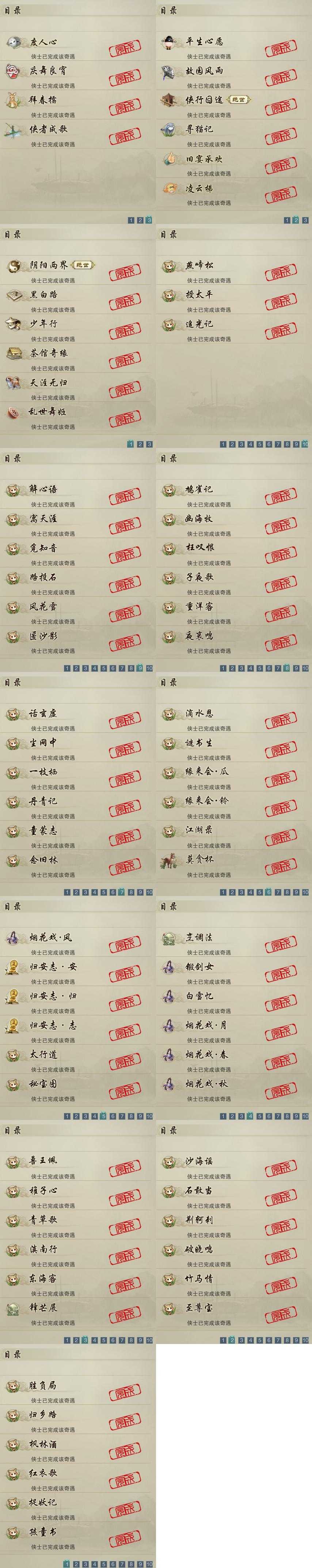 【奇遇】16个[天涯无归, 阴阳两界, 平生心愿, 黑白路, 乱世舞姬, 少年行, 故园风雨, 侠行囧途, 寻猫记, 茶馆奇缘, 庆舞良宵, 凌云梯, 度人心, 旧宴承欢, 侠者成歌, 拜春擂]