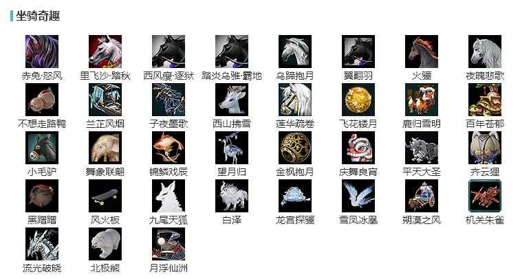 【坐骑】6个[踏炎霸地, 西风瘦逐狱, 乌蹄抱月, 里飞沙踏秋, 劲足赤兔怒风, 黑翅马]